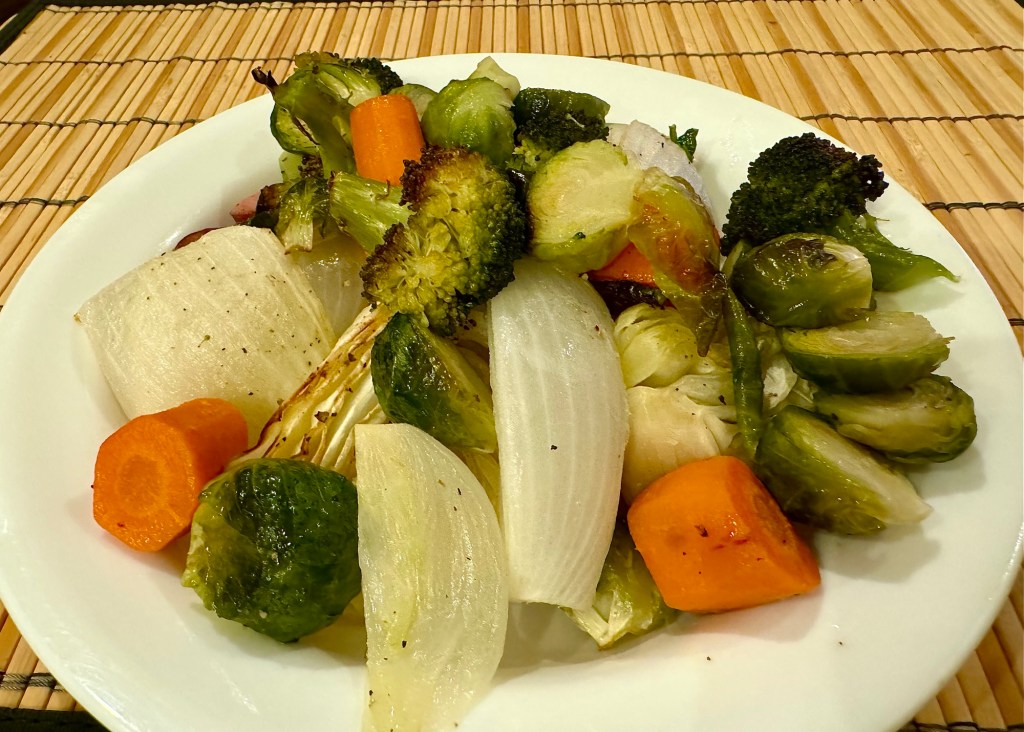 Making a sheet pan dinner is really easy and the clean up is a snap. The vegetables I included were onions, cabbage, Brussels sprouts, broccoli, and carrots. They were seasoned with olive oil, salt, pepper, and ground garlic. I preheated the oven to 400F and cooked the sausage and the vegetables for 30 minutes.