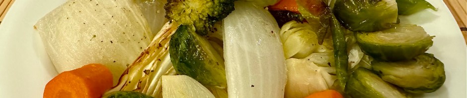 Making a sheet pan dinner is really easy and the clean up is a snap. The vegetables I included were onions, cabbage, Brussels sprouts, broccoli, and carrots. They were seasoned with olive oil, salt, pepper, and ground garlic. I preheated the oven to 400F and cooked the sausage and the vegetables for 30 minutes.