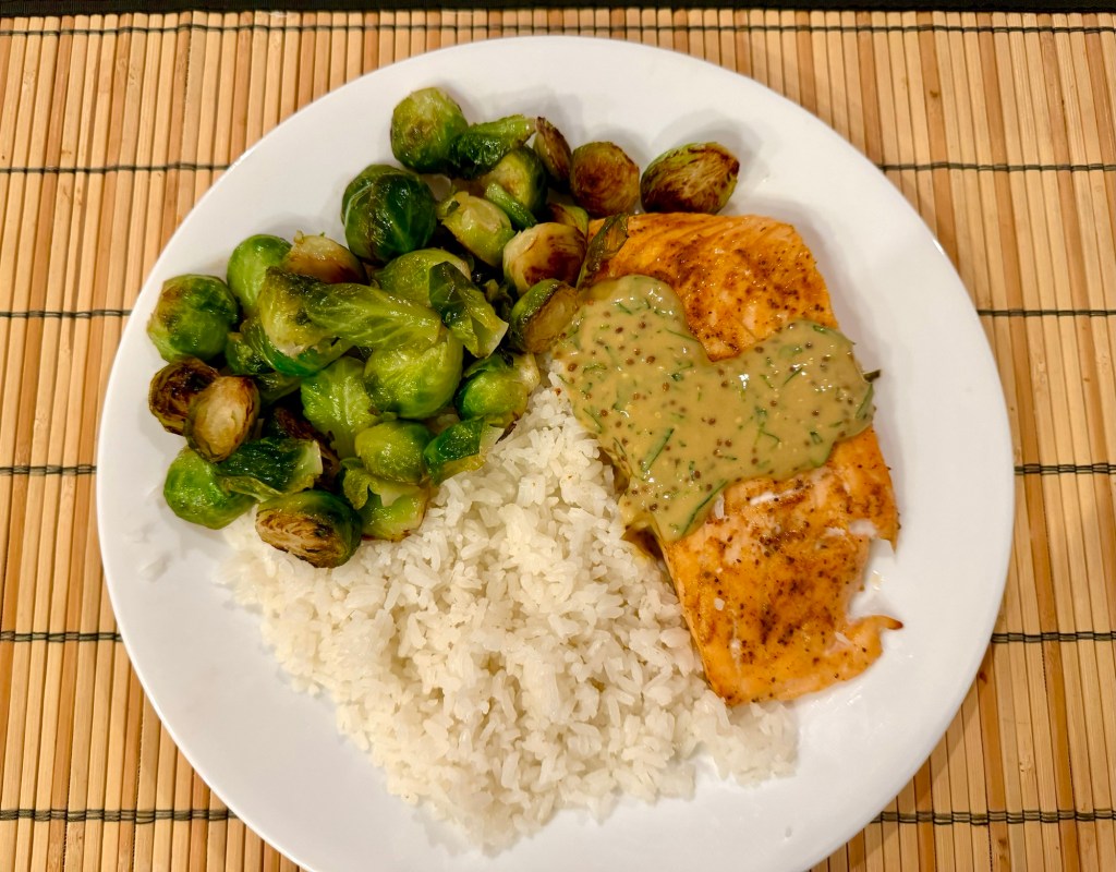 John did a superb job cooking the salmon in a 400F oven for 12 minutes. I was in charge of making the sauce which is the same as my mustard sauce from last week with the addition of fresh tarragon from our daughter’s garden, heating up the rice, and cooking the Brussels sprouts in a large frying pan cut side down so they would brown in the butter and sherry.