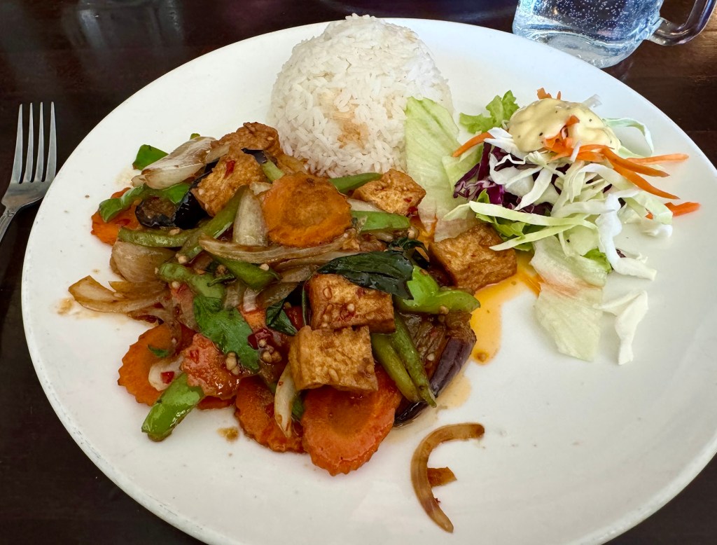 For lunch John and I went to Bangkok 101. We always sit at the same table and order the same dishes. Today when we walked in we were motioned to our table. Then the server said, “Two Thai eggplant with crispy tofu medium spicy!”