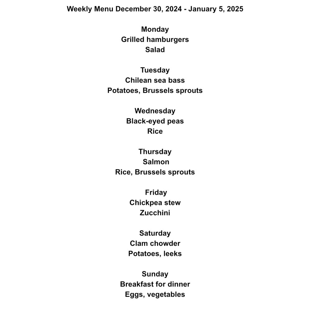 1 Response to Weekly Menu. 12/30/24 – 1/5/25
