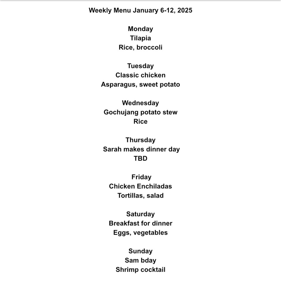 This week we have three events. Our daughter, Sarah, is going to start making one shared dinner per week. We do not know what it will be yet. The other event is our grandson’s birthday. We are meeting at our son’s house in the late afternoon so I am thinking it will be an hors d’oeuvres party. I have volunteered to bring shrimp cocktail. This week also begins our healthy eating regimen.