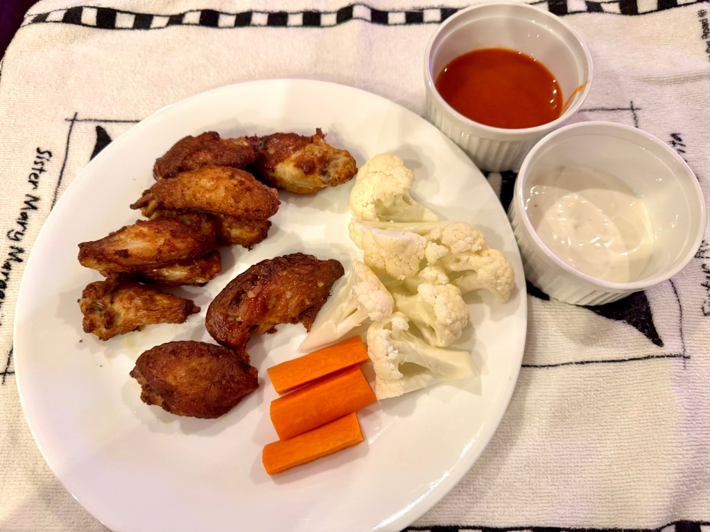 We were supposed to be having our classic chicken dinner tonight but we started watching a cooking program where the contestants were making chicken wings. I knew we had a couple of wings from the chicken we bought today and also some pre-made frozen ones. I could not pass up the lure of chicken wings. I cut up carrots and cauliflower to serve with the wings. The two sauces are Buffalo sauce from the pre-made package and blue cheese dressing. Yum!