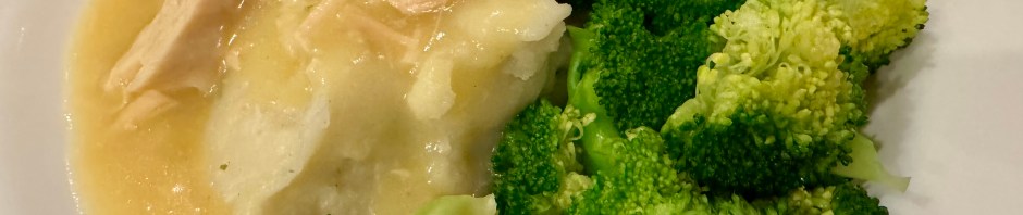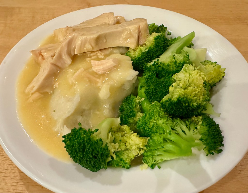 Very easy dinner tonight using a rotisserie chicken breast which we sliced and heated up gently in some packet chicken gravy. The mashed potatoes came from a packet too. John really likes them and it is so much easier than peeling potatoes. The one thing made from scratch tonight was some steamed broccoli. We each had a substantial portion of broccoli and I still have two portions left for dinners over the weekend.