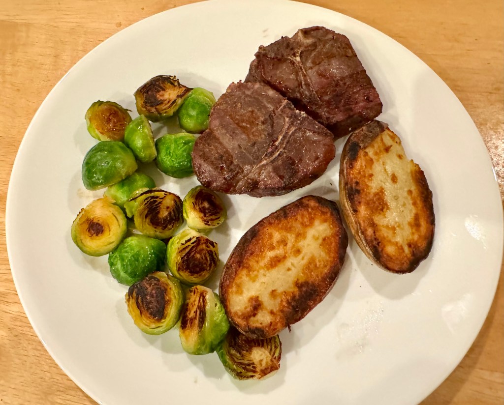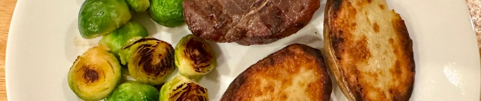 On Tuesday along with our purchase of rotisserie chicken from Costco we also got a package of loin lamb chops. John does such a good job grilling them and we all enjoy gnawing on the bones. For my part I did the zap part of the potatoes (microwaving) and then handed the cooked, split, oiled, and salted potatoes off to John to give them a bit of char on the grill. IDBS refers to Incredibly Delicious Brussels Sprouts. The halved sprouts are started off in a pan with a little water. They are sprinkled with salt, a bit of sugar, and dotted with butter. They cook cut side down, covered for around 10 minutes. Taking off the cover the remaining water dissipates quickly. At this point I add a shot glass of dry sherry. It really enhances their nutty flavor. The sprouts continue to cook until the cut side is brown. They turn out so delicious!