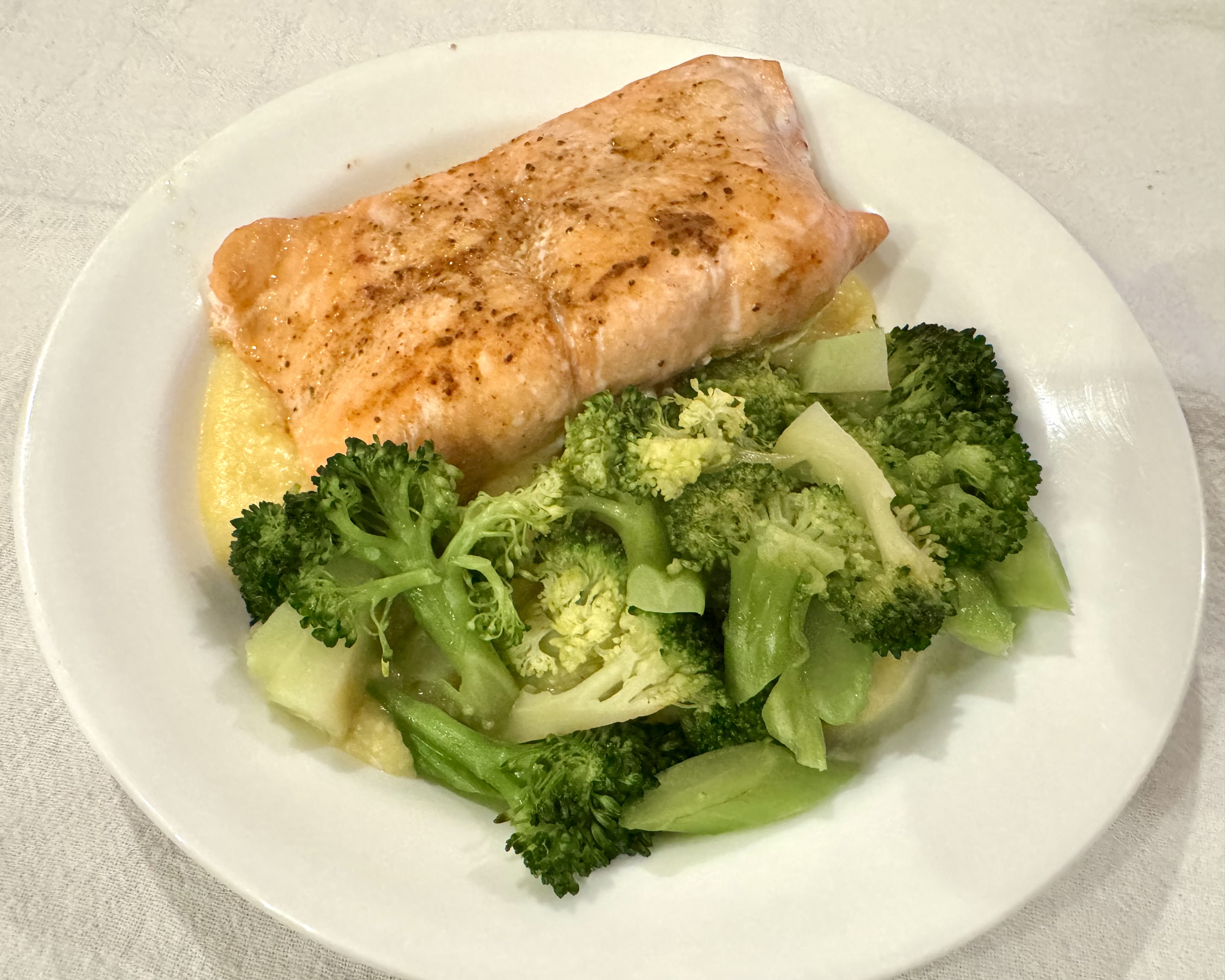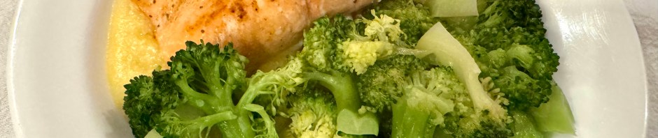 We make a very loose polenta, about a ratio of 6:1, and use it as both a starch and a sauce. It is especially good with broccoli. John cooks the salmon in a 400F oven for 10 to 12 minutes depending on thickness and it is cooked but still moist inside. The whole dinner comes together in about 30 minutes. Easy, quick, and delicious!