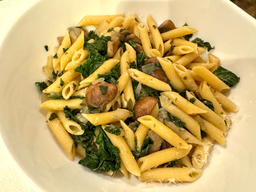 Our dinner for Sunday night was a hearty pasta bowl. While the salted water heated up I sautéed the mushrooms with onions and garlic and wilted the kale in the same pan. When the penne was cooked John drained it and put it in my pan of vegetables. I stirred the penne and veg and then added a half cup of pasta water and a tablespoon of olive oil. We sprinkled some Parmesan cheese on top.