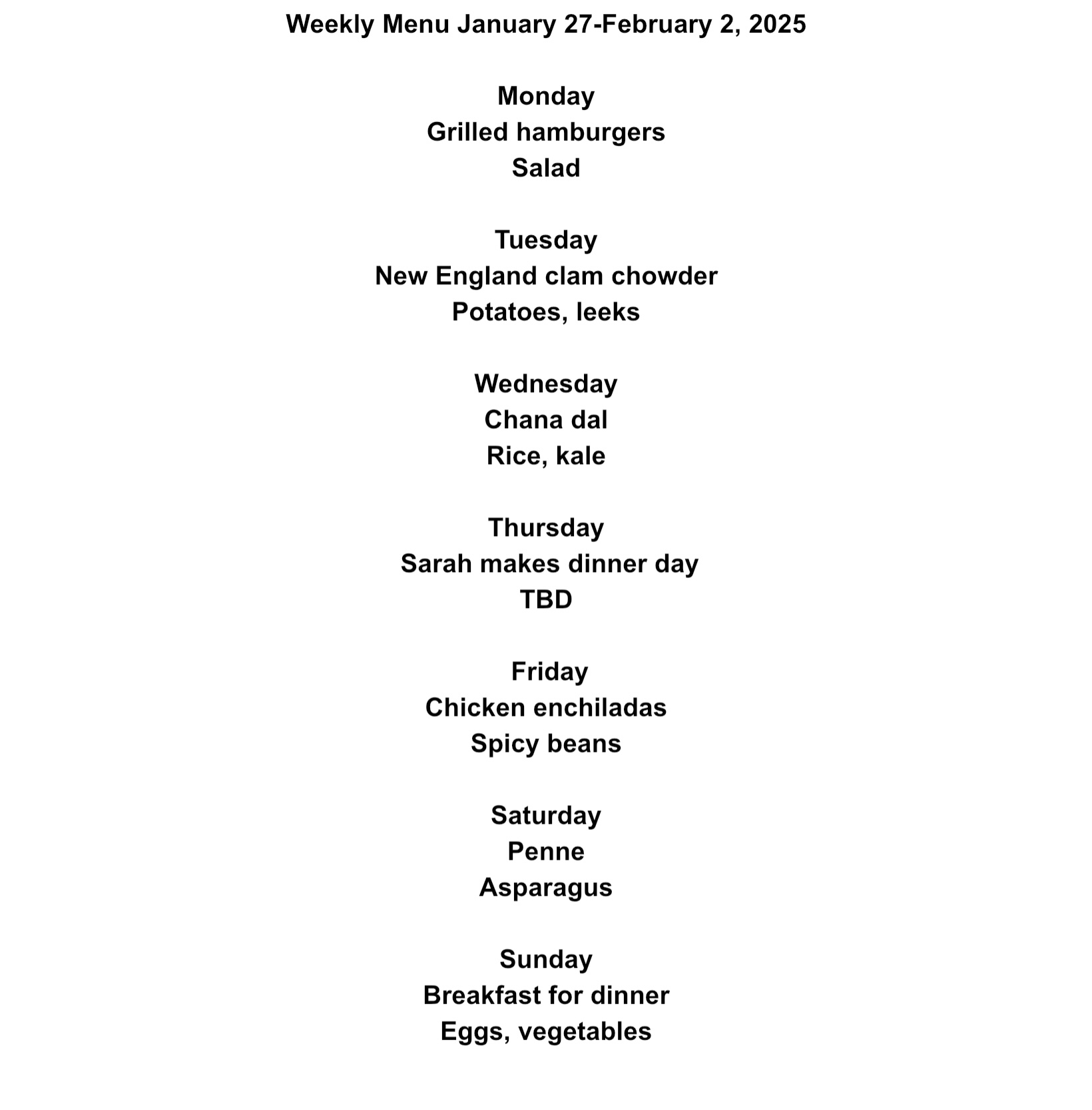 Weekly Menu. 1/27/25-2/2/25
