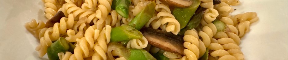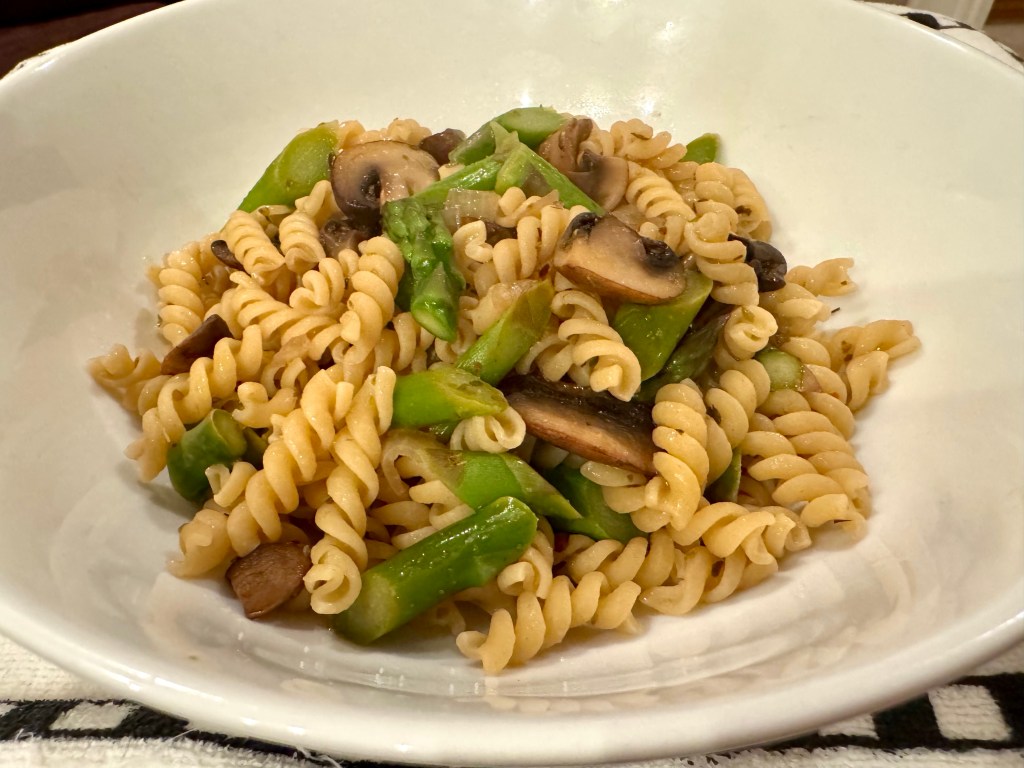 I probably could eat pasta almost every day of the week. I like it with meat sauces, meatballs, sausage, and all kinds of vegetables. Tonight’s pasta dish was made with fusilli cooked to al dente and then incorporated into a pan full of sautéed mushrooms, onions, and asparagus. I finished off the pasta cooking with about 1 cup of the pasta water, stirring the pasta and vegetables until a kind of thin sauce was created. The addition of olive oil completed the dish. John showered his with parmesan cheese but I decided to keep my dish vegan.