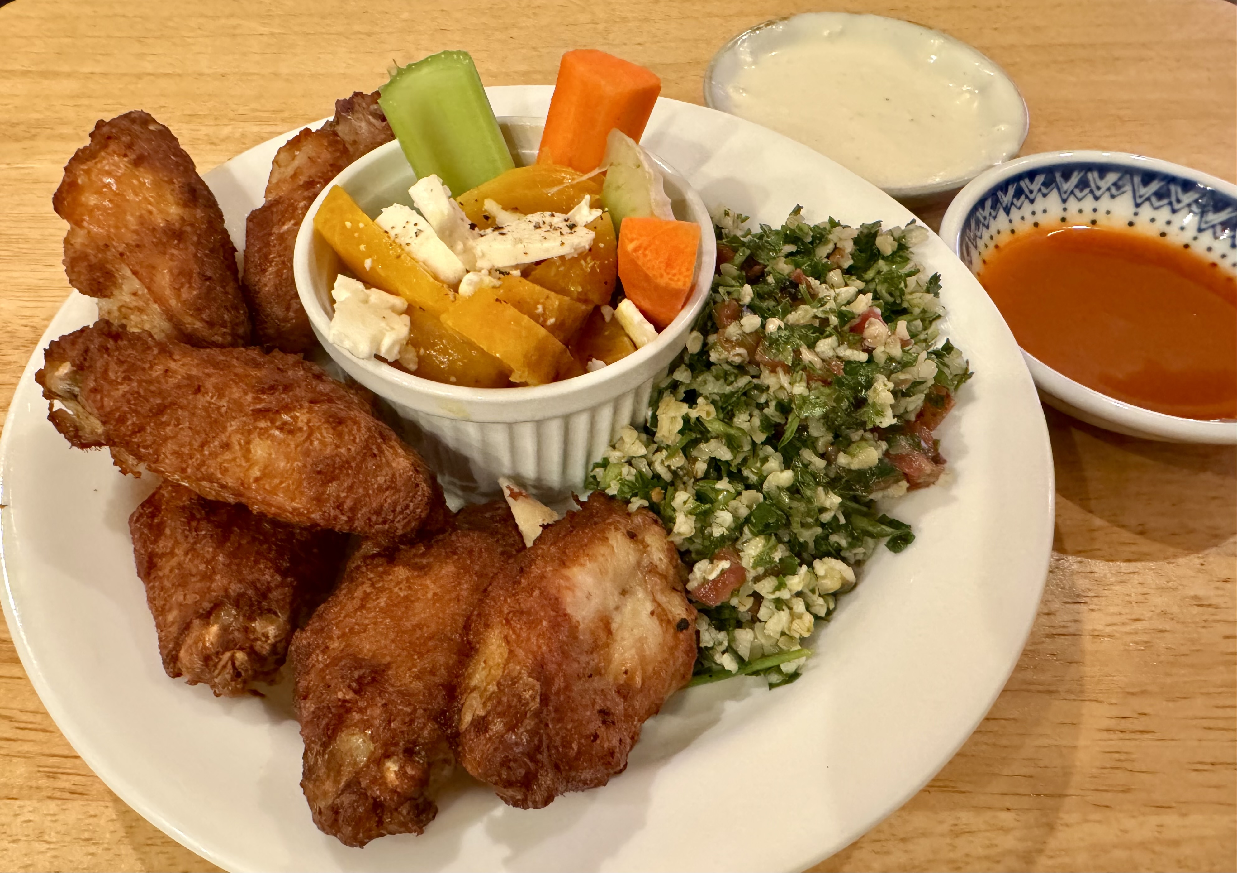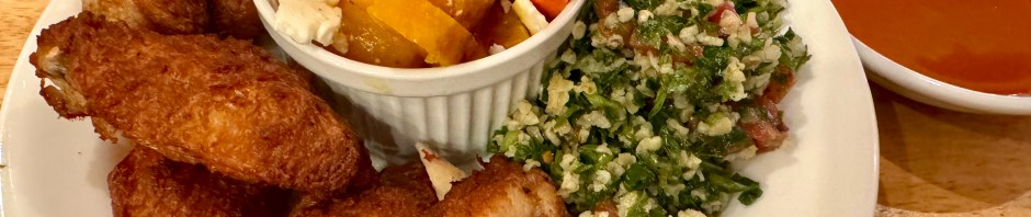 Sometimes I do not feel like making and eating what I planned. In these cases it’s good to have back-up supplies. I had buffalo chicken wings in the freezer which appealed to me and left over tabbouleh and roasted golden beets from yesterday. Voila! A perfectly good easy dinner!