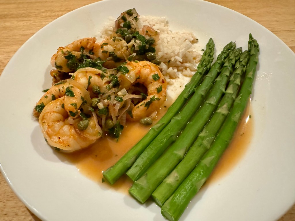 This quick and easy dinner seems good enough for company. The sauce for the shrimp is bright and tangy due to a little lemon juice, white wine, parsley, and capers.