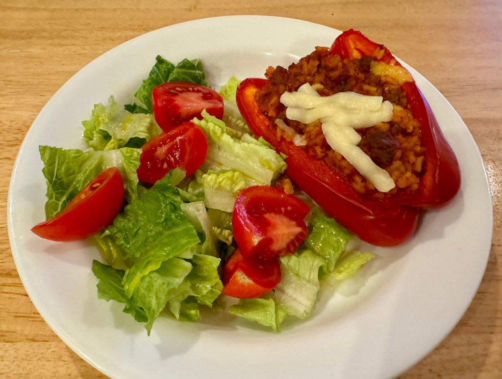 In order to be economical and efficient I browned a pound of ground beef and made a beefy tomato sauce first. Then I took half of the sauce and packaged it up to be frozen for a pasta meal in the future. The other half of the sauce got mixed with a cup or so of cooked rice and stuffed into six bell pepper halves. I had previous microwaved the red bell pepper halves in the microwave for five minutes. I topped the stuffed peppers with some sharp cheddar large shreds and baked the stuffed peppers for 45 minutes at 350F. As you can see the cheese annoyingly never melted. The peppers were quite delicious and went well with a simple salad dressed with olive oil and vinegar.