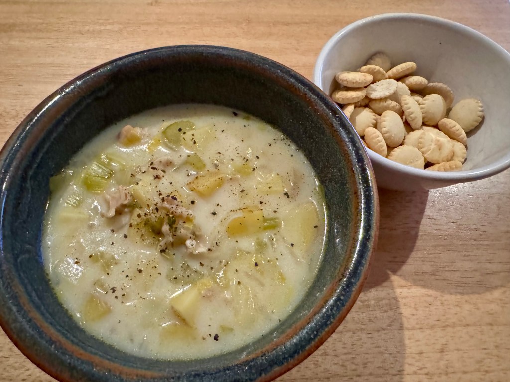 In the winter we probably have clam chowder every couple of weeks. Since John and I met in college in Massachusetts way back in 1968, New England clam chowder is the style we love. Some chowders that you buy are thick and gloppy but the one I make is much lighter depending on clam juice from bottles and clam juice from the cans of clams themselves and only a little cream for the broth. Here ‘s my recipe from a January post.