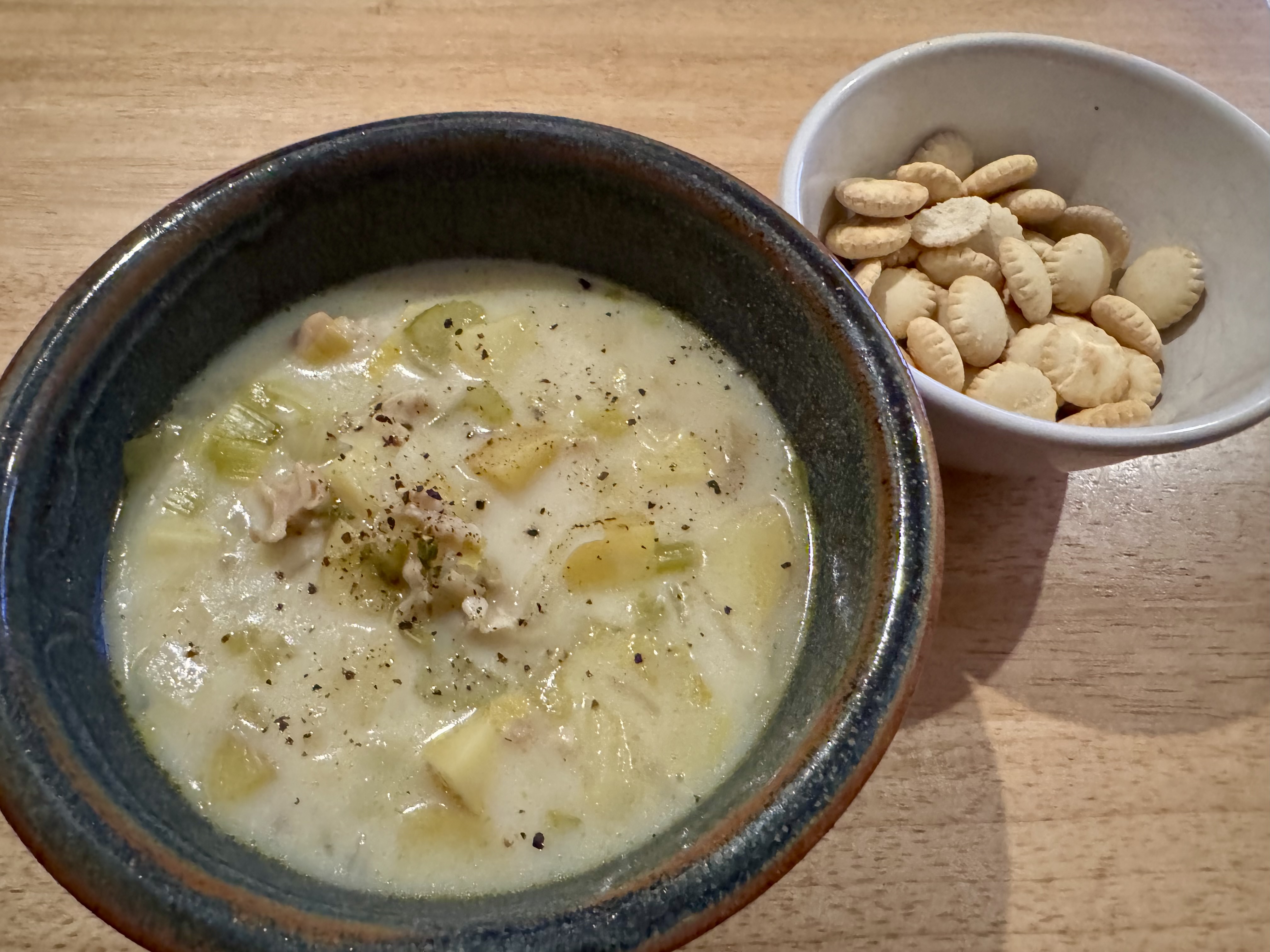 In the winter we probably have clam chowder every couple of weeks. Since John and I met in college in Massachusetts way back in 1968, New England clam chowder is the style we love. Some chowders that you buy are thick and gloppy but the one I make is much lighter depending on clam juice from bottles and clam juice from the cans of clams themselves and only a little cream for the broth. Here ‘s my recipe from a January post.