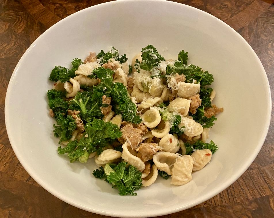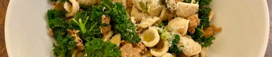John is taking over cooking duties this week while I am away. Tonight he makes one of his favorites, orecchiette with sausage and greens. This is a dish we first had in Puglia, the heel of the boot of Italy.