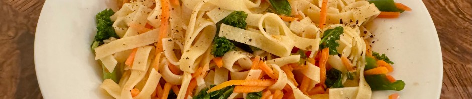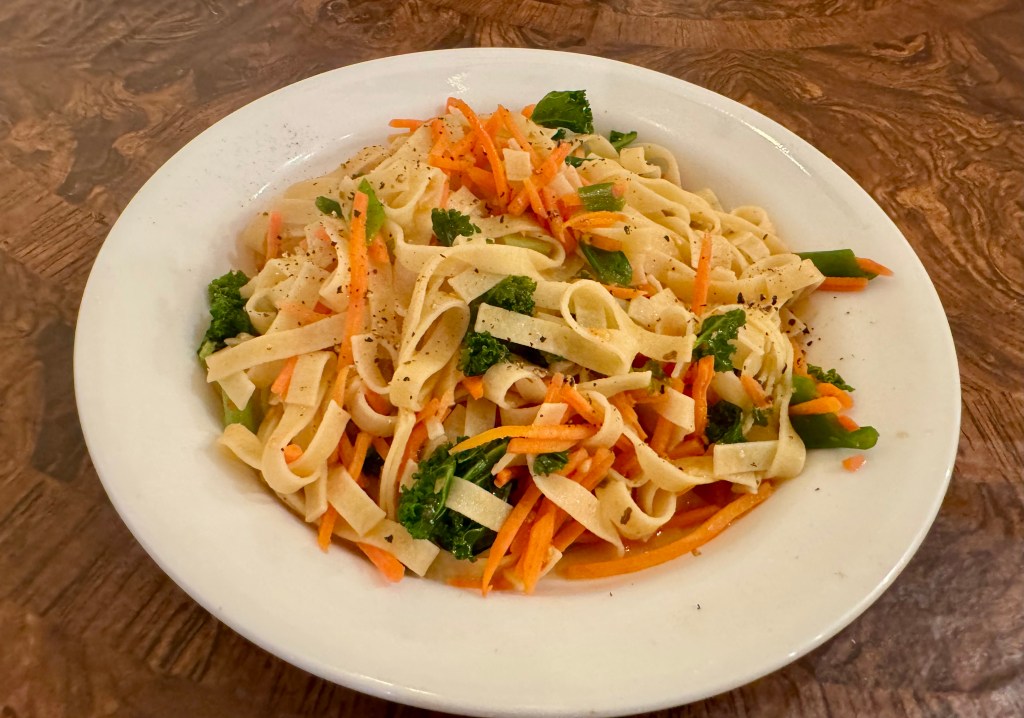 On Sunday I decided that I just did not want to eat eggs. Instead I boiled a couple of ounces of pasta and when it was done I put it back in the pot with some shredded carrots, kale, green onions, a little pasta water, and olive oil. I stirred this over heat and in no time I had my vegetarian Sunday dinner.