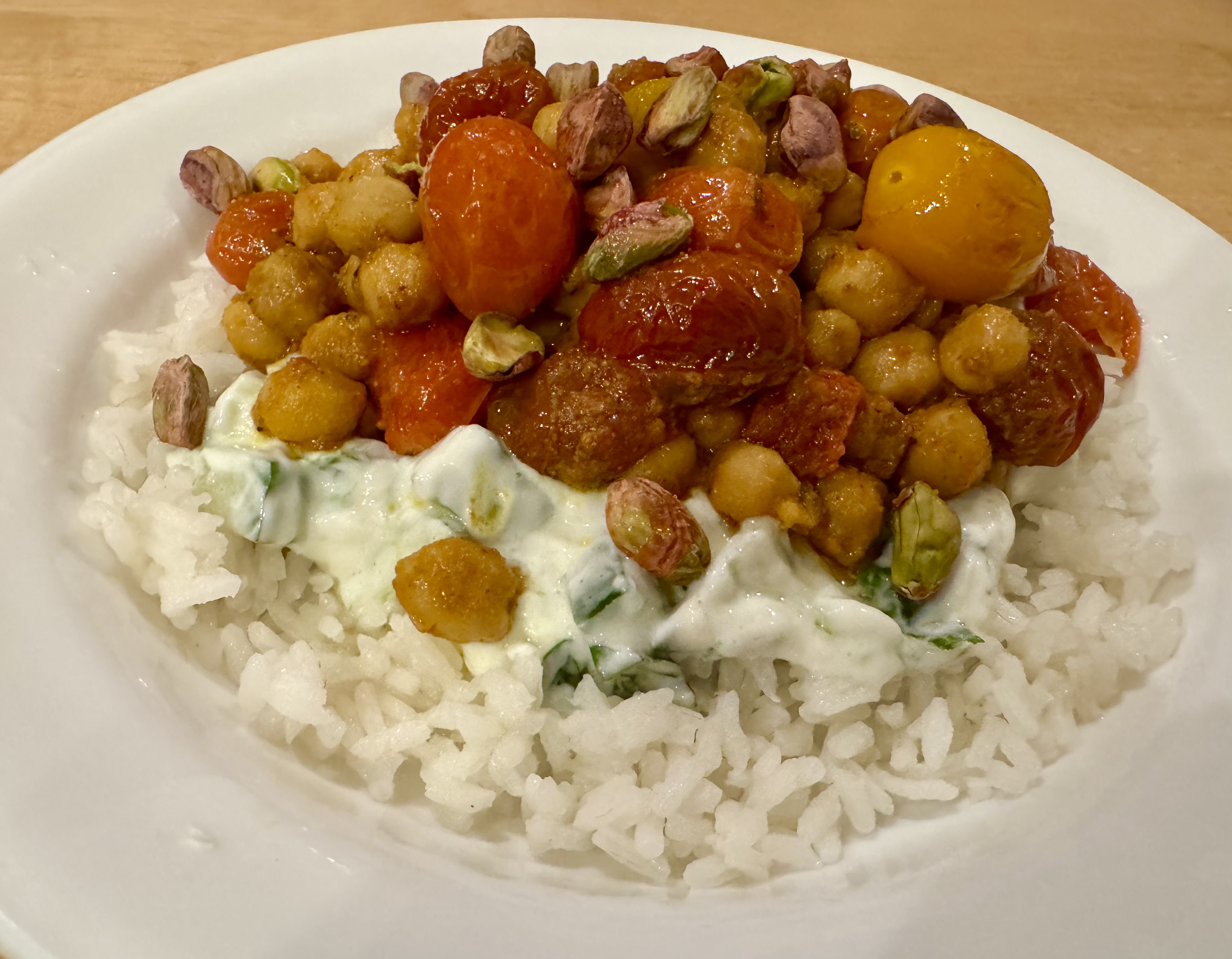 This is a new recipe for us and needs a little working on. The tomato and chickpeas part was delicious, the rice was fine, but the raita overpowered everything. Next time I might thin the raita out a bit and serve it on the side.