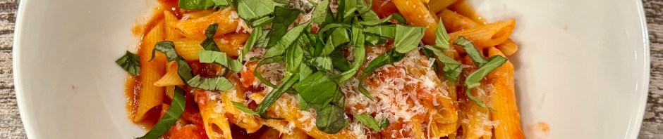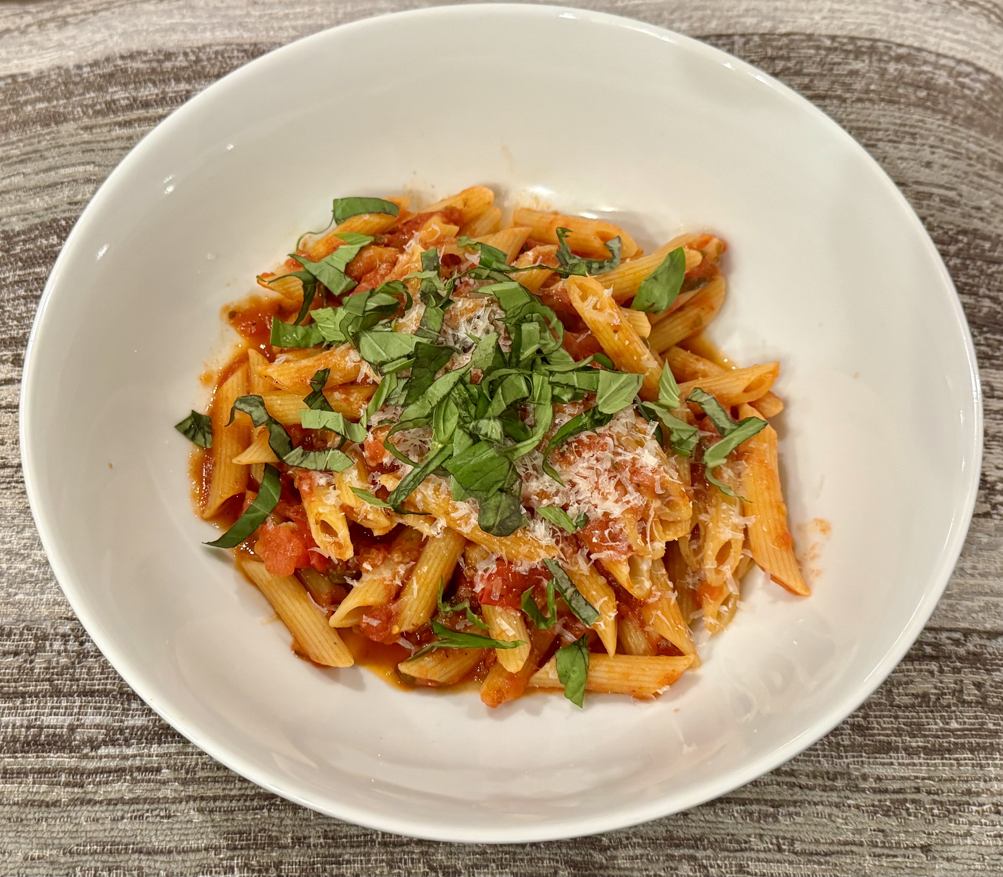 John and I were out most of the day visiting old friends who were staying near their kids and grandkids in the North Bay. Since we would not be back home until 6 PM I figured we would need a quick and easy dinner. I had defrosted some leftover Rao’s tomato and basil sauce so while John cooked up the penne pasta I worked on enhancing the jarred sauce with onion, garlic, oregano, basil, red pepper flakes and my secret ingredient, fish sauce! Fish sauce brings the umami while tamping down the sweetness that commercial products seem to always include. With a sprinkle of basil leaves and parmesan our dinner was ready in about 15 minutes.