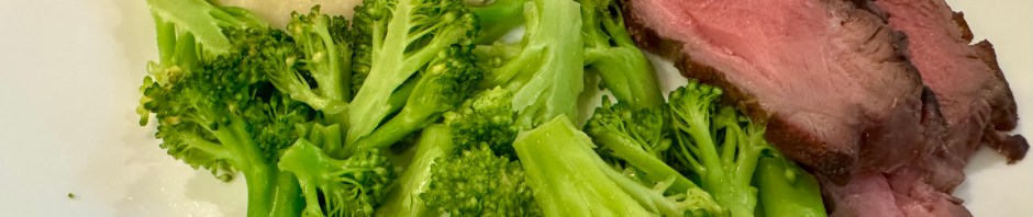 The broccoli was freshly made for tonight’s dinner but everything else was a leftover. We made the lamb by grilling it on Sunday and the potatoes came from last night’s dinner. To reheat the lamb John set up the sous vide apparatus and warmed the meat at 125F for 90 minutes. When it was done it was still pink and juicy. Nothing tasted like a leftover!