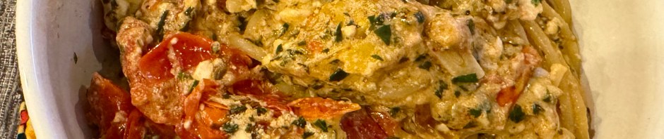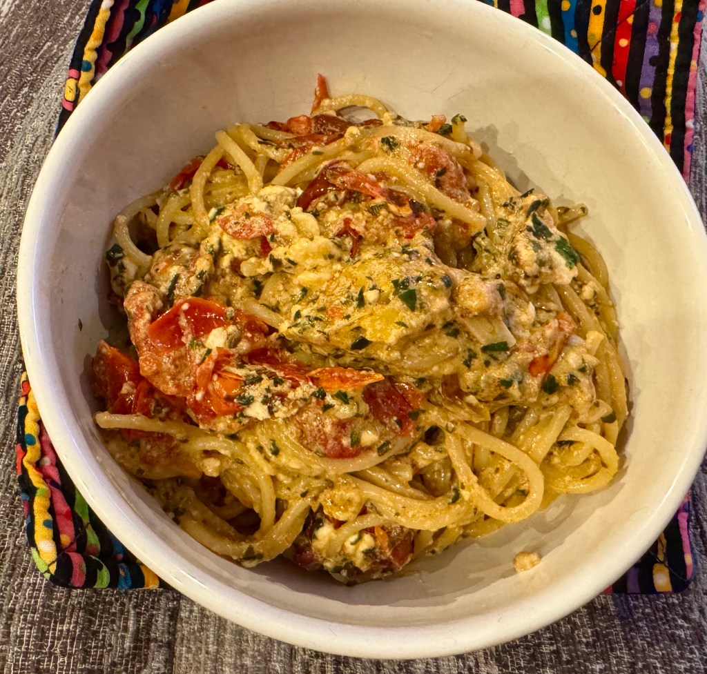 Thursdays are Sarah’s nights to cook. Tonight she made a pasta dish with spaghetti, roasted cherry tomatoes, olive oil, and feta. It was delicious!