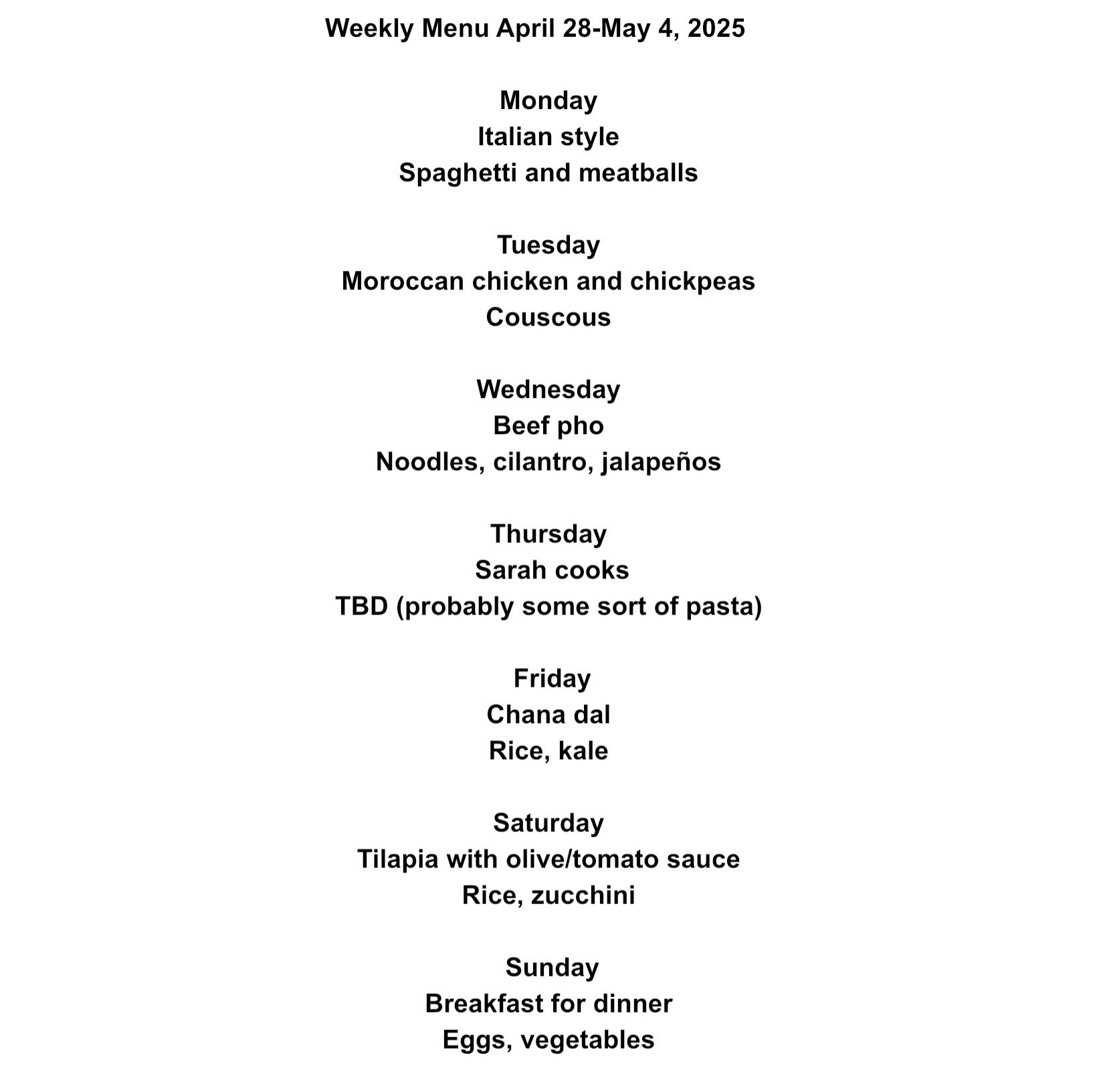 Weekly Menu. April 28-May 4, 2025