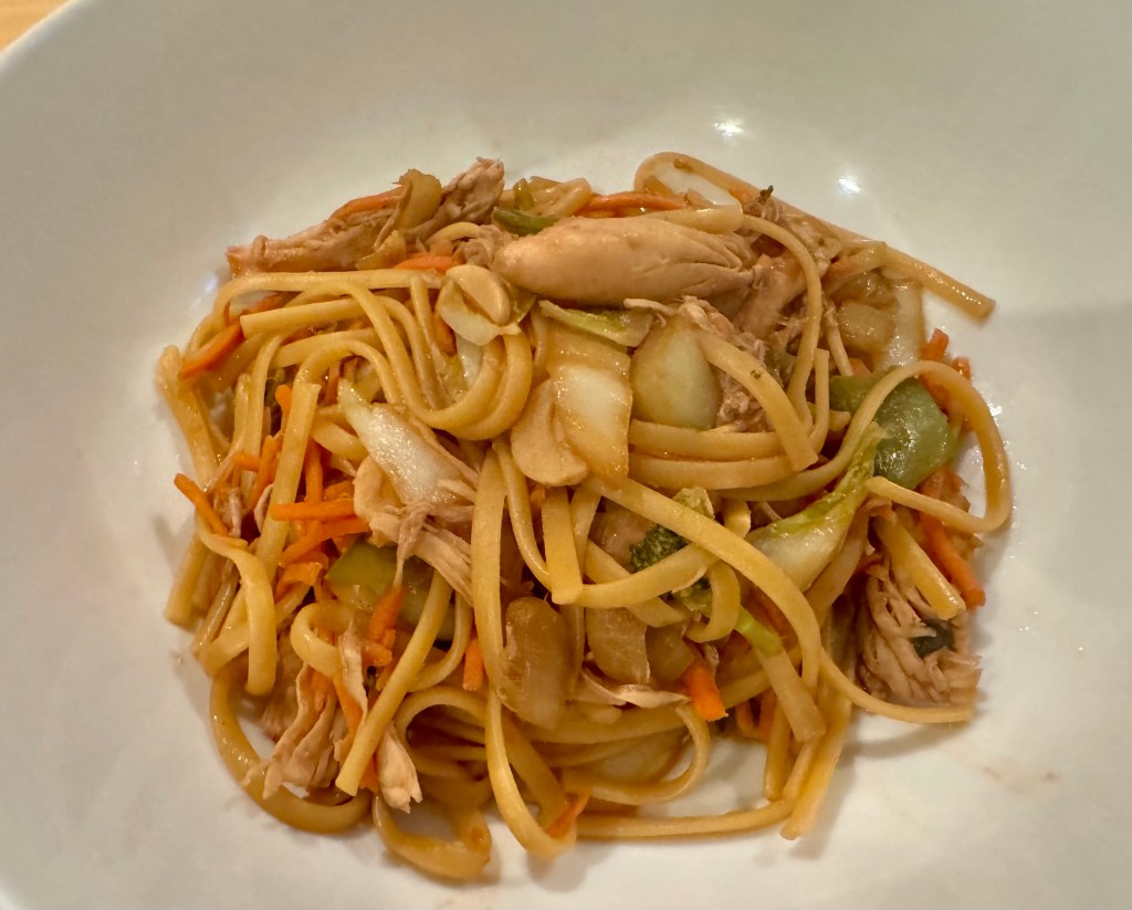 This was supposed to be a stir-fry with noodles and a bunch of different vegetables. Unfortunately I overcooked the vegetables and it ended up being more like a chicken stew with noodles, vegetables, and a soy based sauce. It was still totally edible but just not as good as the other times I have made it.