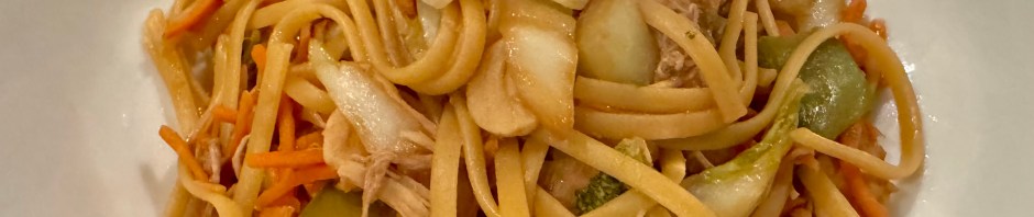 This was supposed to be a stir-fry with noodles and a bunch of different vegetables. Unfortunately I overcooked the vegetables and it ended up being more like a chicken stew with noodles, vegetables, and a soy based sauce. It was still totally edible but just not as good as the other times I have made it.