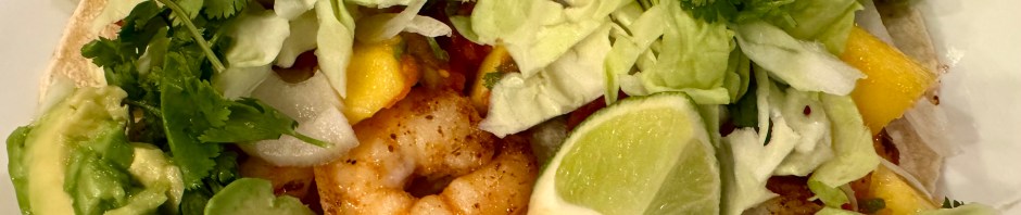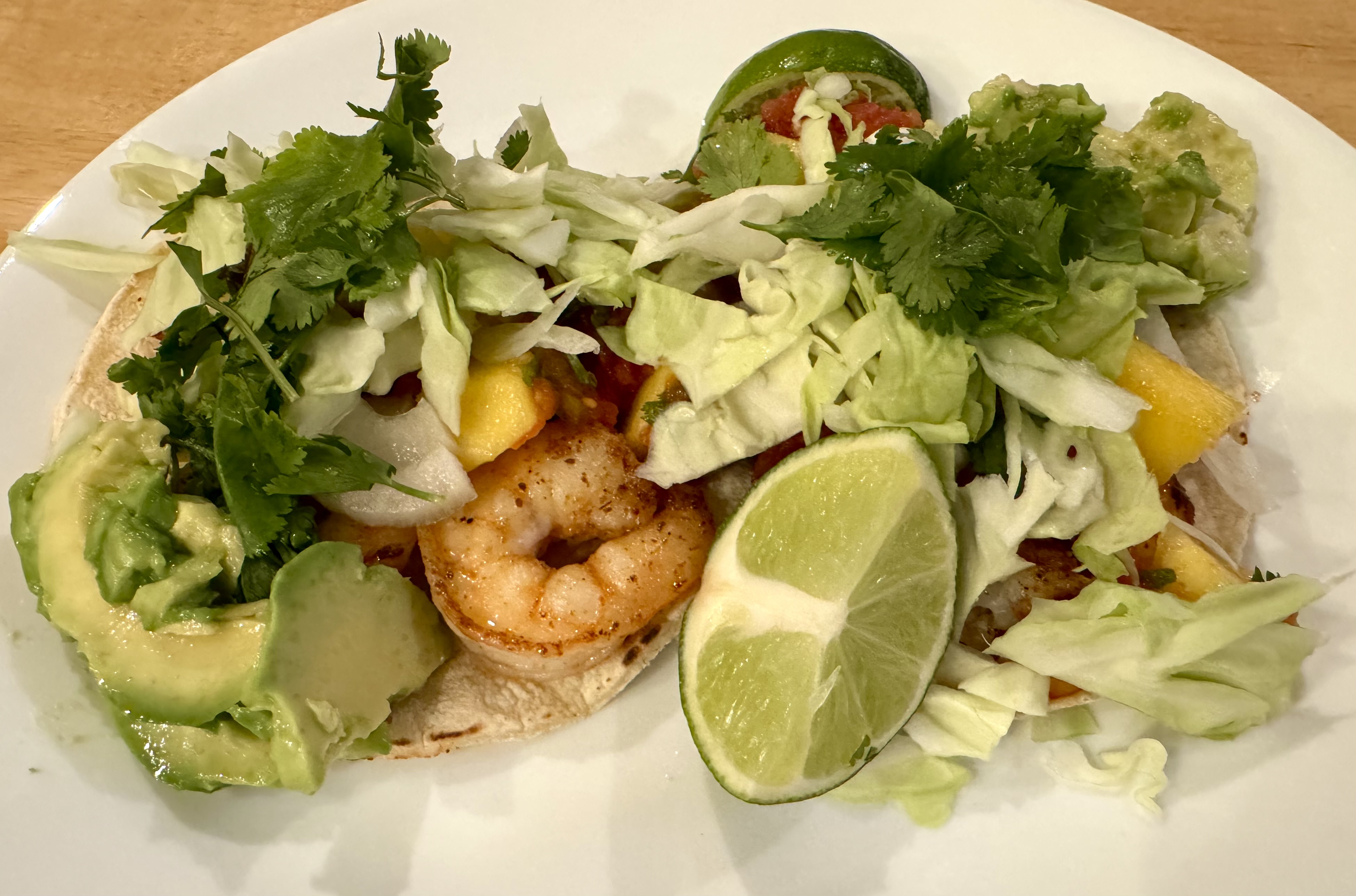Tuesday was definitely Taco Tuesday at our house! Sarah and I went out for lunch and had street tacos and then, according to my menu plan, John and I made shrimp tacos for dinner. John does such a great job sautéing the shrimp which were just cooked through on the inside and had a snap as you bit through the outside. I made the accompaniments—mango salsa, sliced avocado, cilantro, onions, and shredded cabbage. Tacos two times in a day? Twice as good!