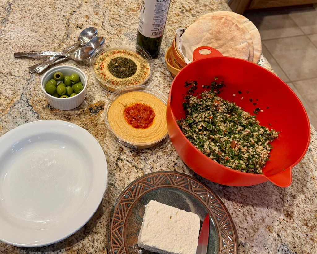Originally it was supposed to reach 90F for the first hot day of the season. Actually I think it was only 86F but I had planned this hot night dinner and was thus commanded by the menu hanging in my kitchen to make it. Truthfully there was not much to make with the exception of the tabbouleh which came out probably the tastiest I have ever made. Here is the recipe I mostly follow—https://cooking.nytimes.com/recipes/1012585-tabbouleh?unlocked_article_code=1.JE8.hsPV.fcS-0yBRDYln&smid=ck-recipe-iOS-share. I used petite diced canned tomatoes with a little added sweetener instead of whole chopped tomatoes because it is not tomato season yet. I also use more bulger wheat. I am careful with the amounts of lemon juice, olive oil, and salt I add, tasting as a go along.