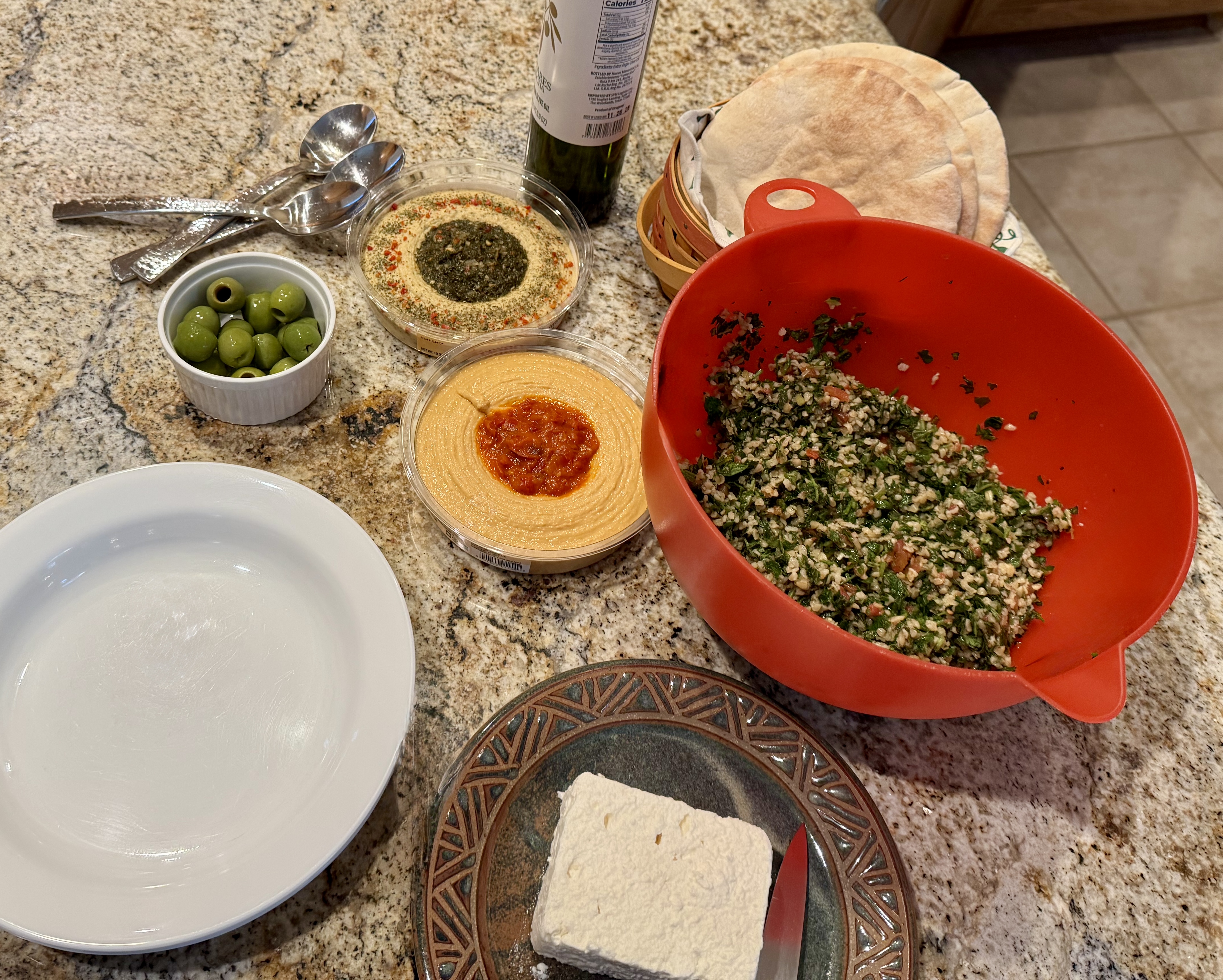 The easy parts of the dish were the pita, feta, and hummus since they were all store-bought. I got two kinds of hummus, one with red peppers and one with chimichurri, to keep the hummus interesting. My favorite pita is Toufayan.