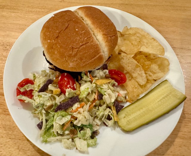 We had a small family grill night for Memorial Day. John cooked the hamburgers expertly and also put some char on the corn. I made up a salad and we shared part of a bag of chips.