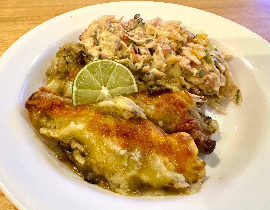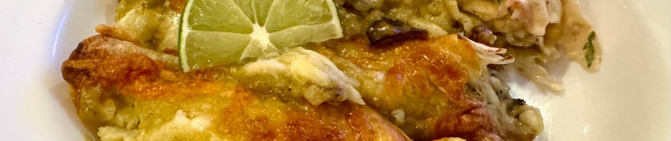 For our enchiladas John sears the tortillas first so they have a charred flavor. Then I take the tortillas and fill them with shredded chicken, diced onions, shredded cheese, and green enchilada sauce. I nestle them in a 9 x 9 baking dish. The entire casserole is covered with more enchilada sauce and cheese and bakes in a 400F oven for around thirty minutes until they are warmed through and the cheese is melted.