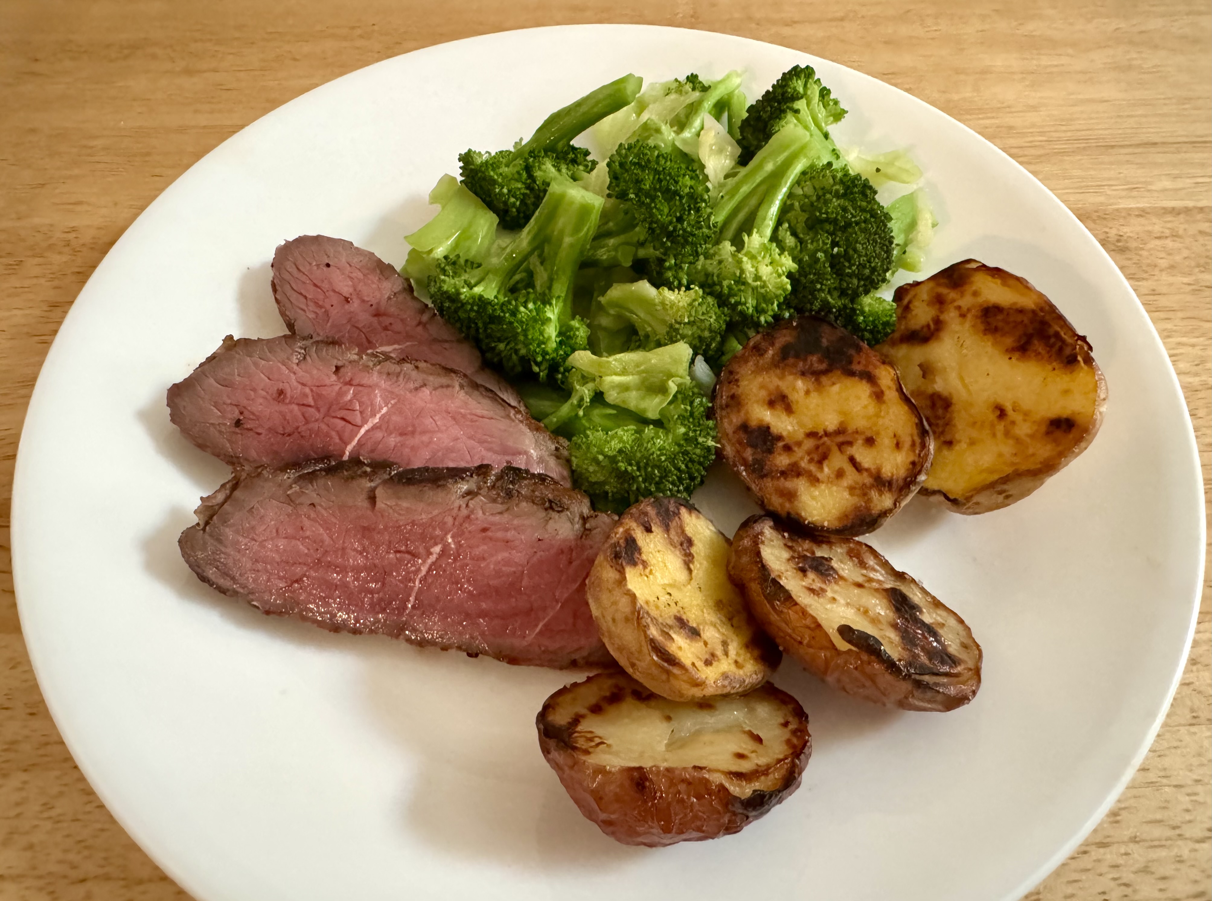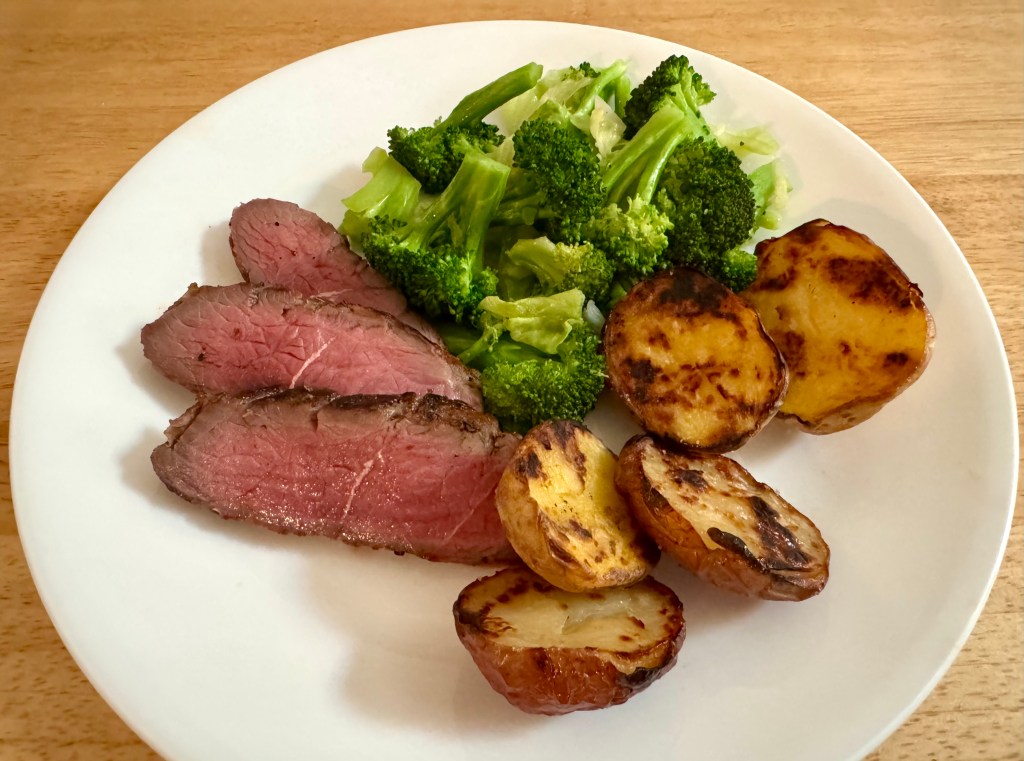 When we bought this boneless leg of lamb a couple of weeks ago John cut it into three pieces. We ate the first piece on the day we bought it and froze the other two. We decided to thaw and grill the two smaller pieces for the dinner tonight and for sandwiches and soup on Sunday. John did a great job grilling the lamb to medium rare. I microwaved the new potatoes and then cut them in half. I rubbed the cut sides with olive oil and salt and passed them on to John for some time on the grill to get a little char. Although you cannot really see it I added cabbage to the broccoli to stretch our veggies since all three of us were eating this dinner. Broccoli and cabbage are in the same family and the cabbage brought sweetness to the vegetable dish.