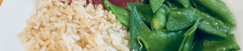 I had cooked brown jasmine rice earlier in the day using the oven method. I mixed it with some white rice leftover from our salmon dinner last week. The snow peas I harvested from the Trader Joe’s fresh stir fry vegetables that I used for several lunch soups. Waste not, want not!