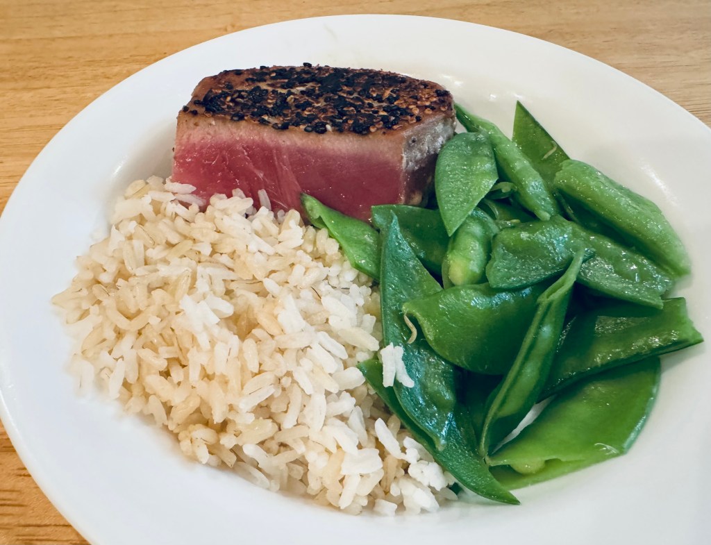 Our tuna dinner was very economical and delicious! I bought two seven ounce frozen tuna pieces on sale for $5.99 each. So the three of us ended up having almost 5 ounces of tuna each for $4 a person. Try ordering tuna in a restaurant for that price! John crusted the tuna with sesame seeds and cooked the pieces in a hot skillet for 3 minutes per side. It was perfect!