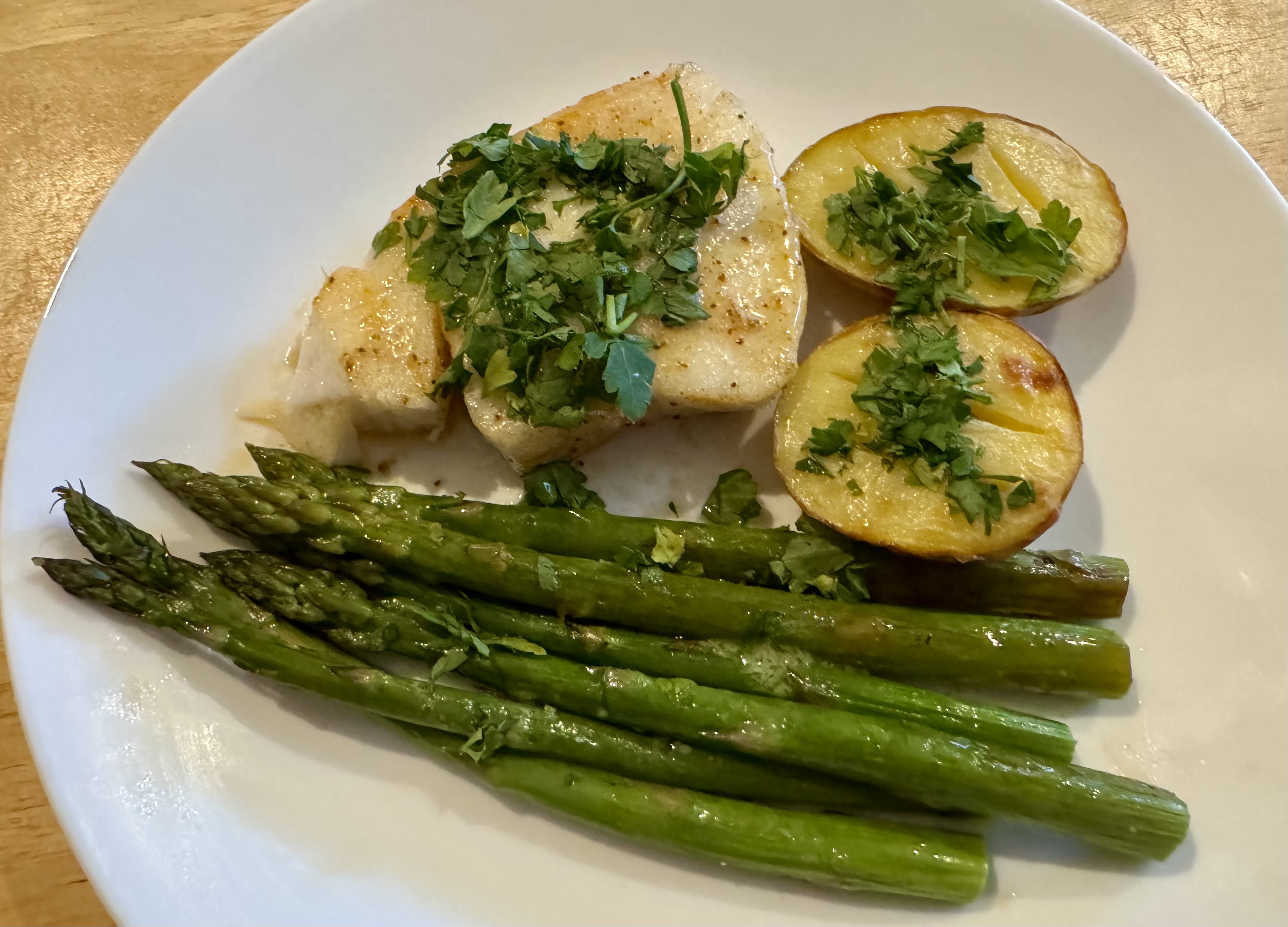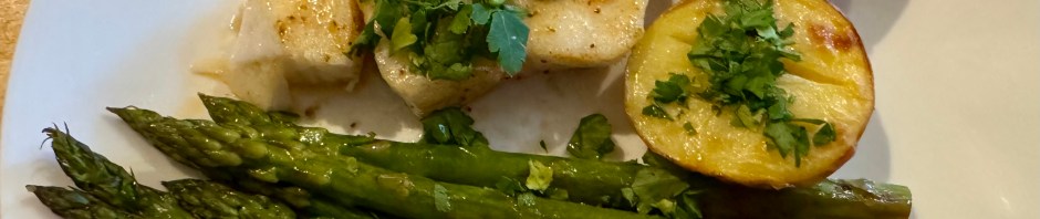 Yesterday’s economical meal left room for a splurge tonight. John stopped at Costco and picked up a very nice piece of Chilean sea bass to divide amongst the three of us. Since we were already turning on the oven (425F) we decided to cook all three components in the oven at staggered timings. The potatoes went in first and got a 15 minute head start over the fish and asparagus. The fish and asparagus went in for 12 minutes. Everything was seasoned with salt and olive oil. Each component was perfectly cooked and served with a little butter, parsley, and a squeeze of fresh lemon. This was a really delicious dinner and we all enjoyed it immensely.