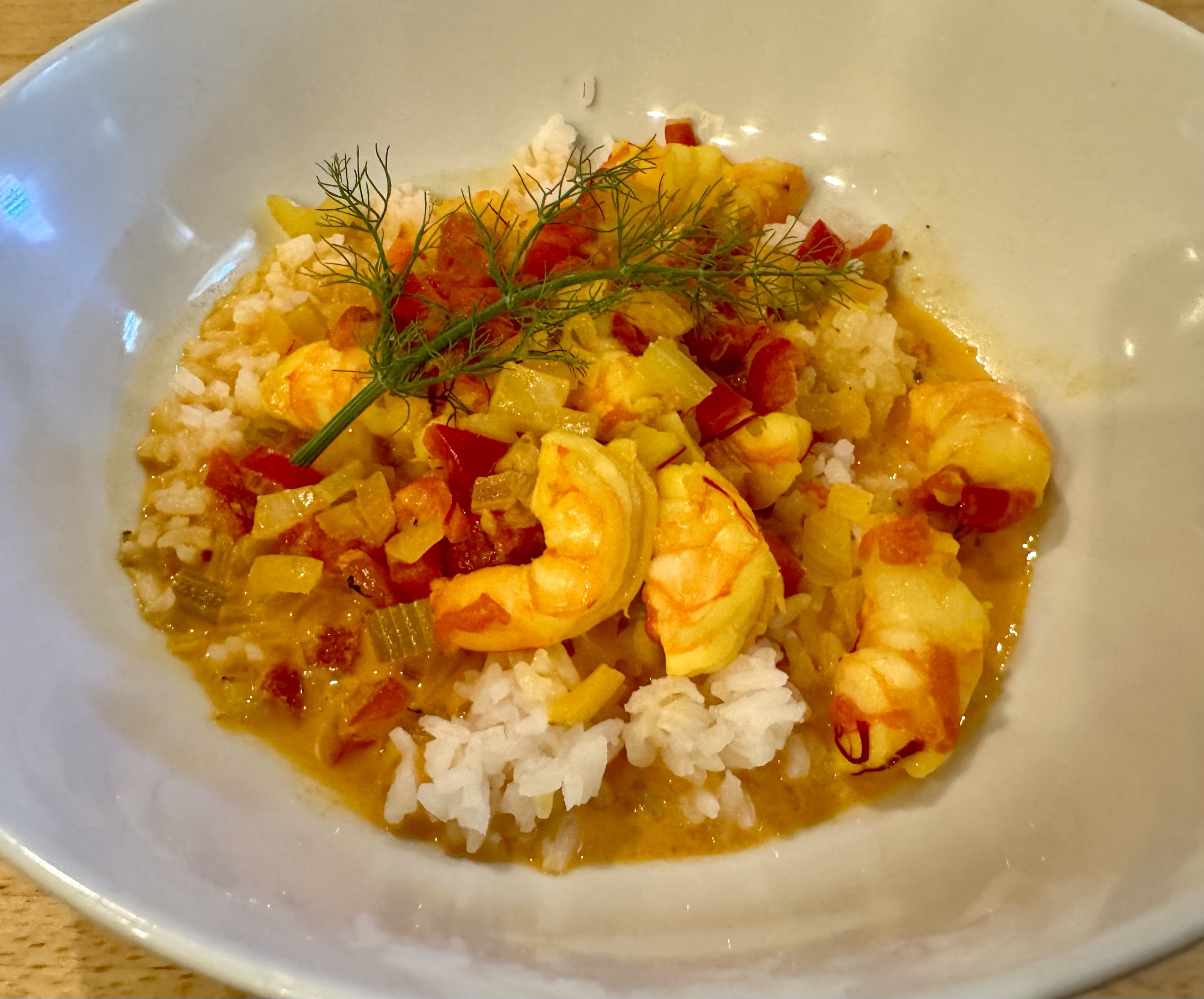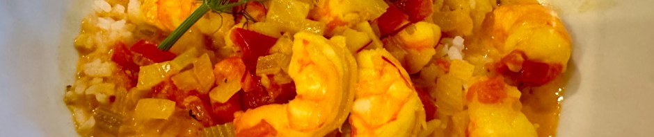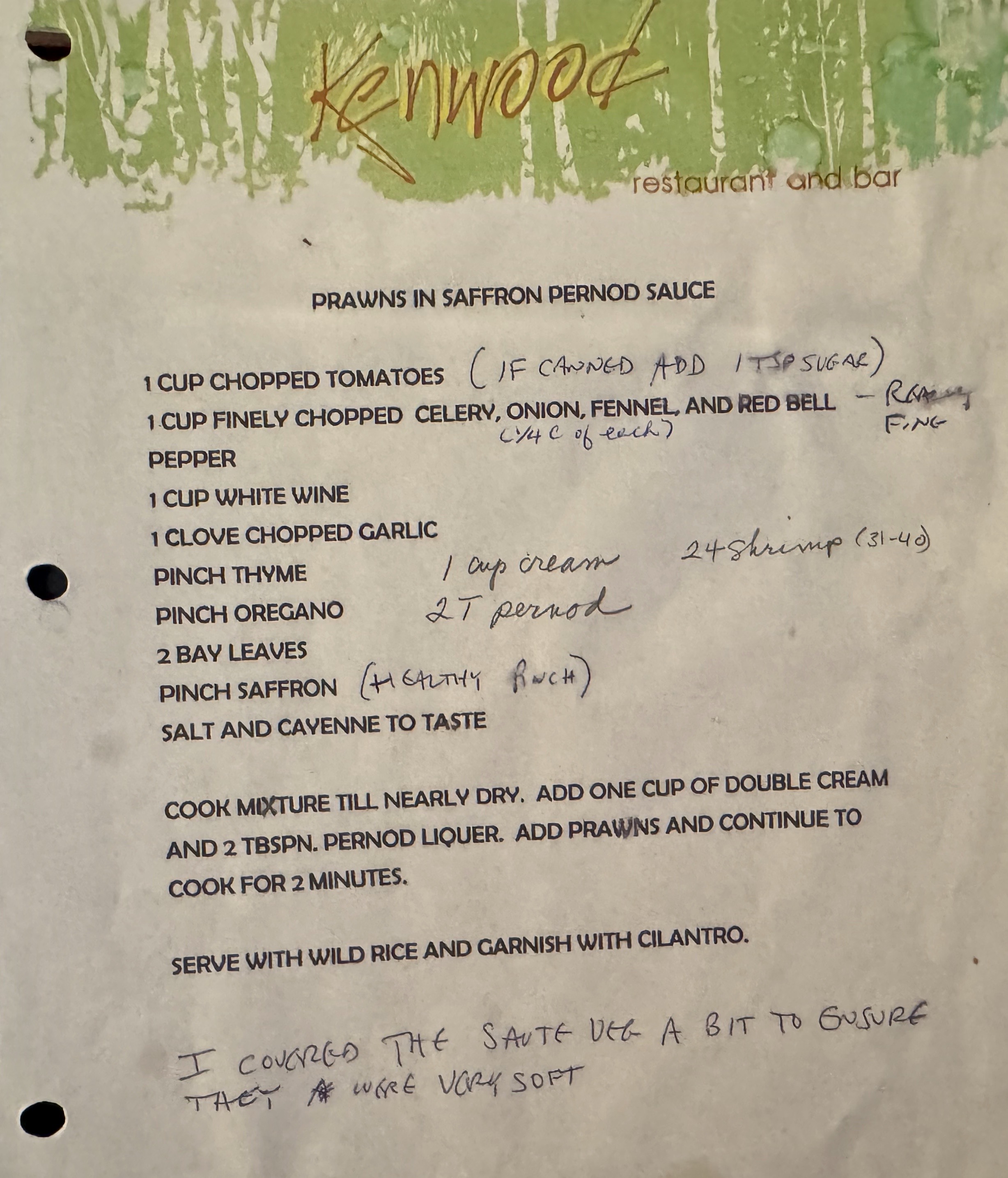 Below is the original recipe that they copied for us. You can see we have several notations on it. We normally double the sauce adding 1 cup of tomatoes and 1/2 cup of the other vegetables. We also flame off the Pernod because otherwise it turn out too booze-y. We increase the liquid to 1 cup clam juice or shrimp stock and 1 cup (usually less) of cream. Our Thursday night dinner included six 21-25 shrimp cut in half per person.