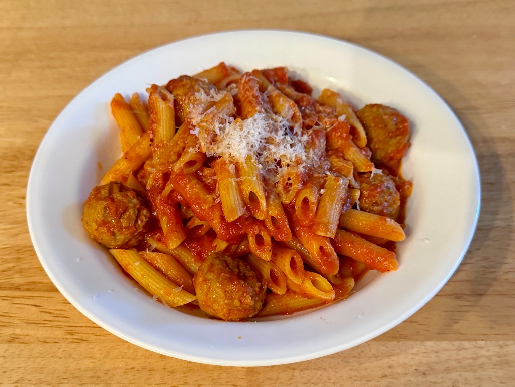 Tonight we had a lazy dinner. It was comprised of Barilla pasta (which we did have to cook), Rosina’s frozen meatballs, and Rao’s jarred vodka sauce. It turned out surprisingly good. I really enjoyed the Rao’s vodka sauce. The main reason that I bought it was because it was cheaper than Rao’s basil and tomato sauce which we usually buy. I think from now on I will stick with the vodka sauce, BTW there is no vodka flavor in the sauce.The meatballs were perfectly serviceable for frozen meatballs. We grated the parmesan cheese from a block I bought from Costco,