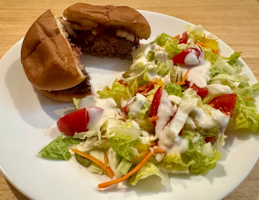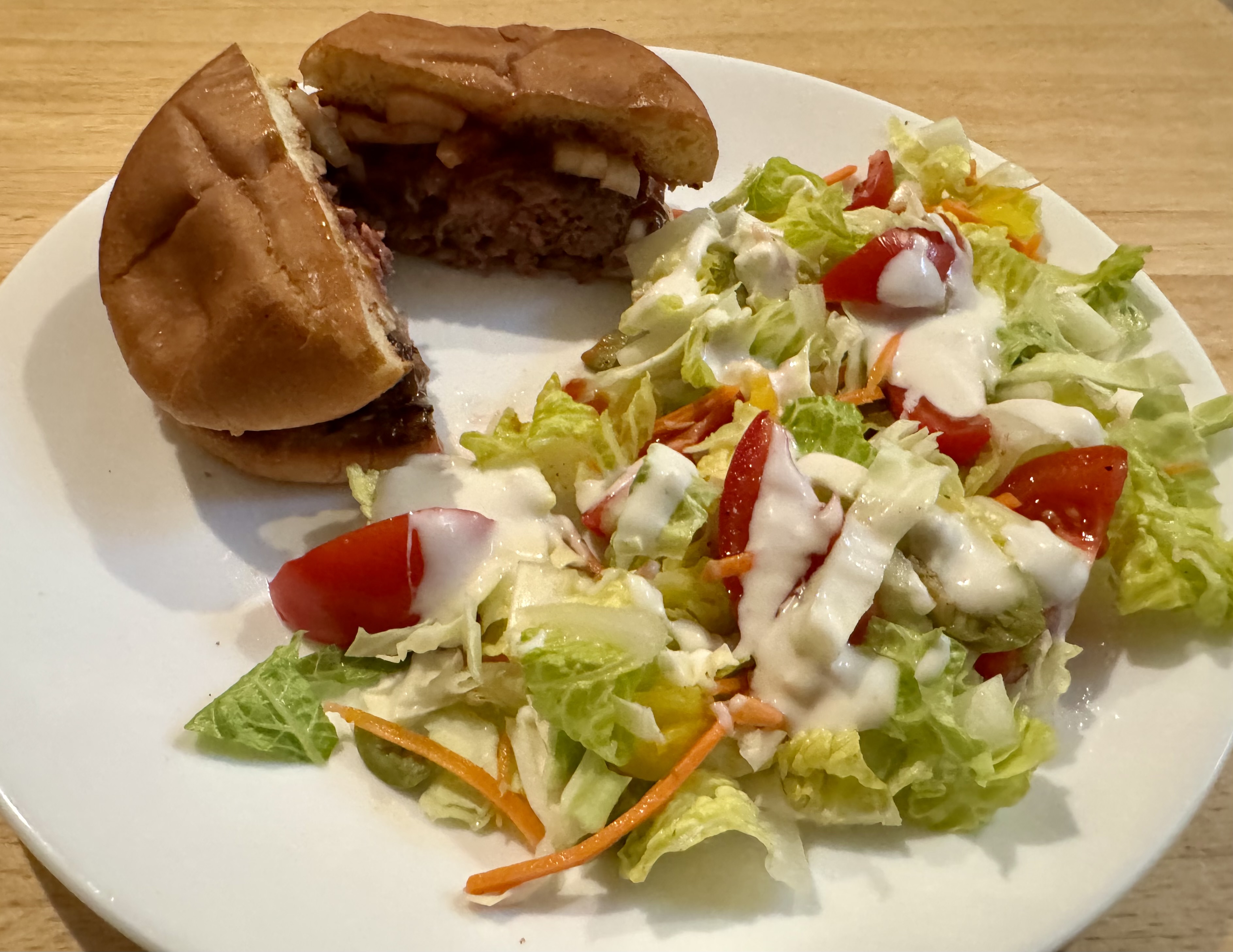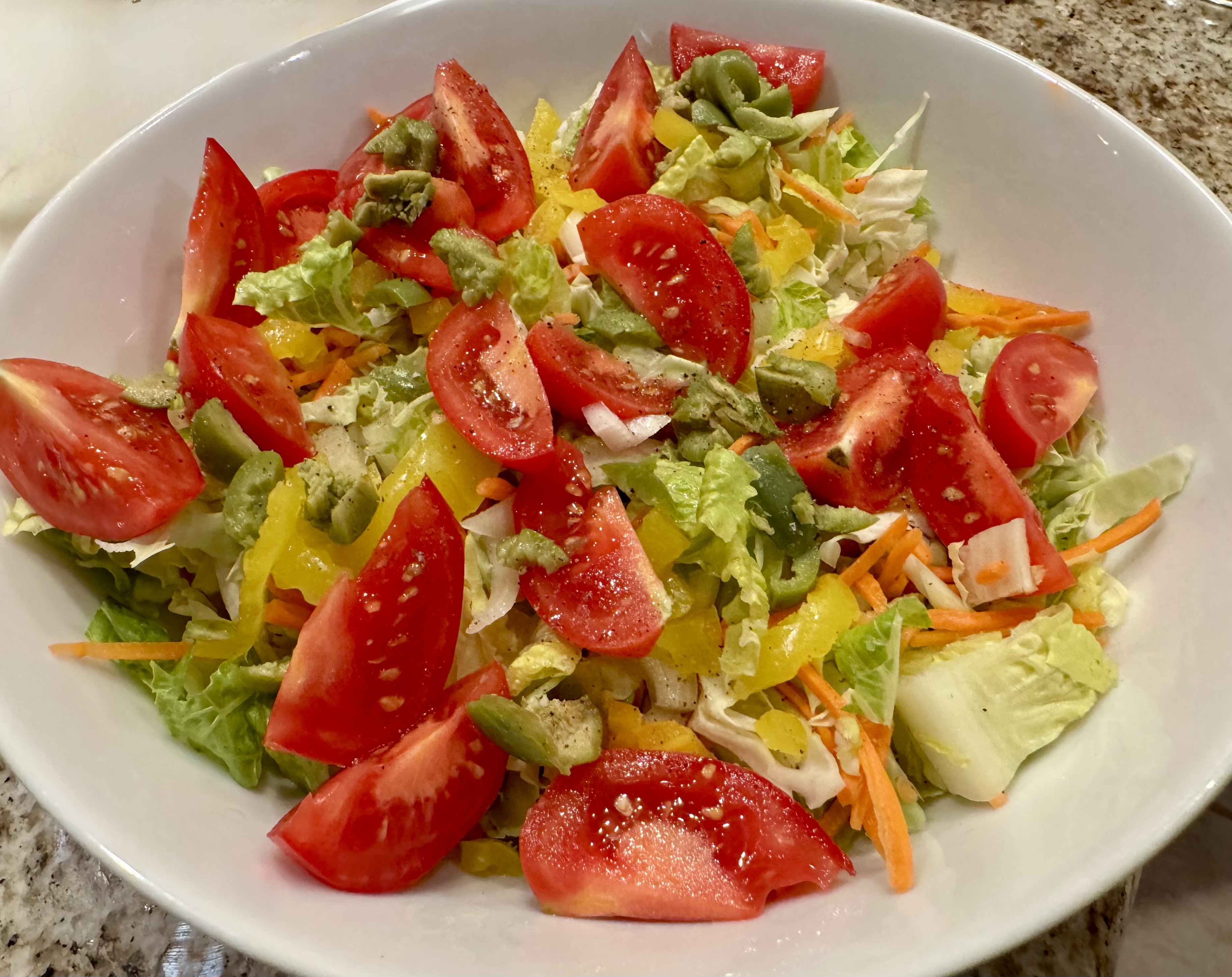 As much as I dislike making salads, I did spend some time trying to make tonight’s tasty and appealing. Along with Romaine lettuce our salad included banana peppers, tomatoes, cabbage, carrots, onions, and olives. Everyone enjoyed it and there were no leftovers.