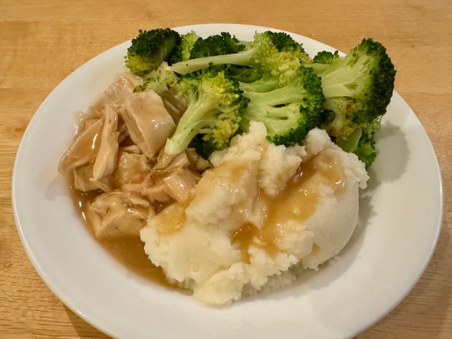 Anyway once in a while I like to have this throwback meal which is easy to make what with rotisserie chickens, packet gravy, and instant mashed potatoes. Only the broccoli needs cutting up and cooking.
