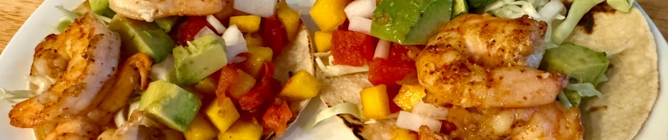 I realize that shrimp tacos are not quite standard Fourth of July fare. We are having the family over on Sunday for a more traditional burger cookout. For our shrimp tacos John did his usual superlative job of cooking the shrimp. I made the toppings including a tasty mango/tomato salsa. Happy Fourth!