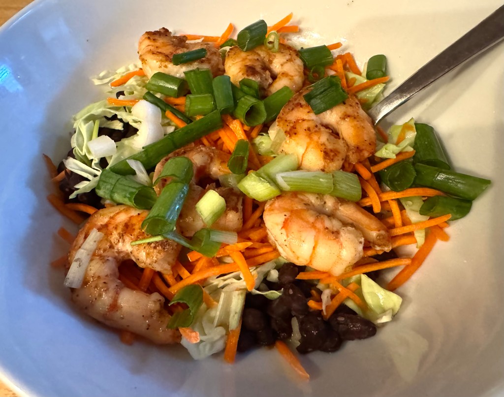 After a non-cooking Friday night due to an event we attended we were supposed to have shrimp tacos on Saturday. As often happens towards the end of the week I was not feeling like what had seemed a good idea when we put the menu together. So I made a weird concoction. John was still eating shrimp tacos so I took my shrimp, the green onions, cabbage and beans from the tacos and added shredded carrots. I enveloped this in a nuoc cham sauce and served it over rice. Vietnamese/Mexican fusion!