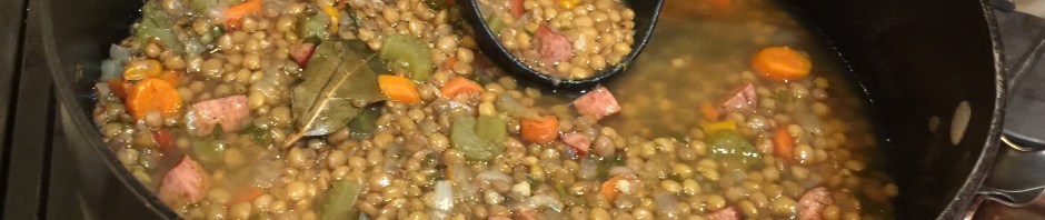 Lentils with turkey sausage makes for an economical and comforting dinner. I start chopping the vegetables and John starts the cooking right away. First I chop the onion and garlic which he starts cooking in some olive oil. By the time he’s got the onions ready I have finished chopping the celery and carrots. They go in the pot. Next we add the herbs and spices followed by chicken stock and the lentils. Lastly the sliced turkey goes in. The whole thing cooks at a simmer for about 25 minutes or until the lentils are cooked through. The whole dinner costs less than $5.00 and is packed with flavor, fiber, vitamins, and protein.