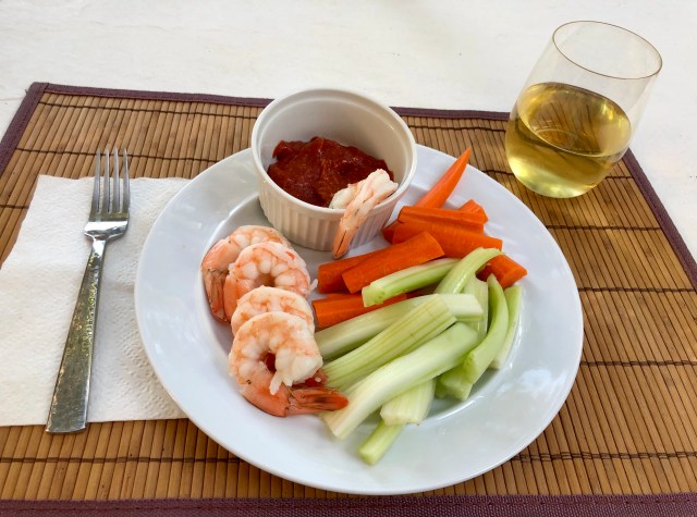Some people brought sandwiches for themselves. Others ate the shared offerings. John and I brought shrimp cocktail, Chardonnay, and fresh cut-up vegetables with a dill dip. The shrimp were definitely a hit with the yellow jackets!