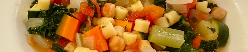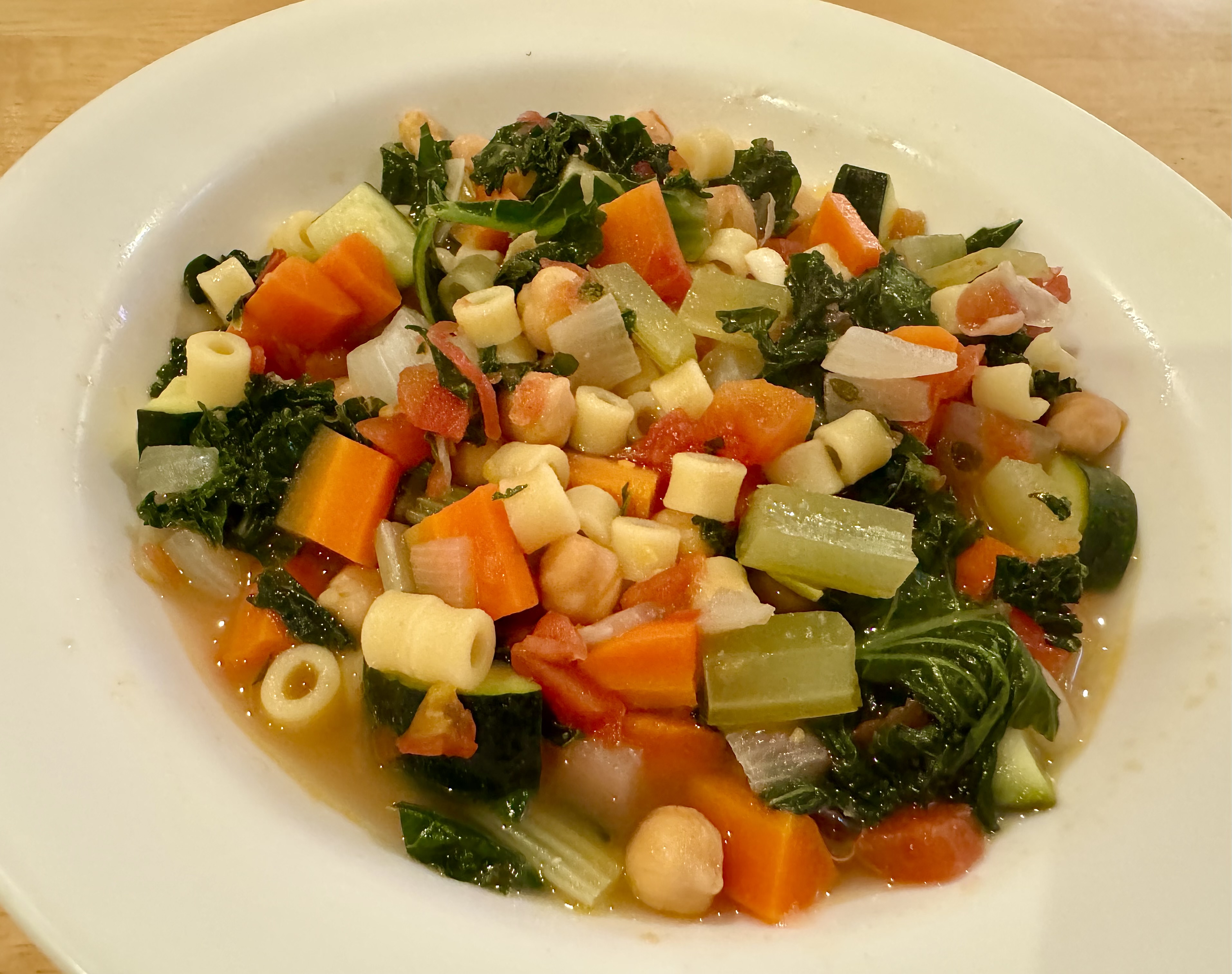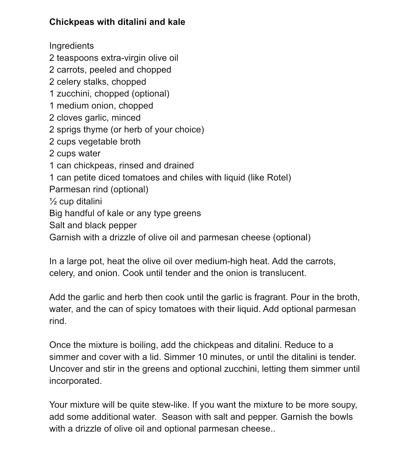 This delicious chickpeas, vegetables, and pasta stew can be easily made vegetarian or vegan.