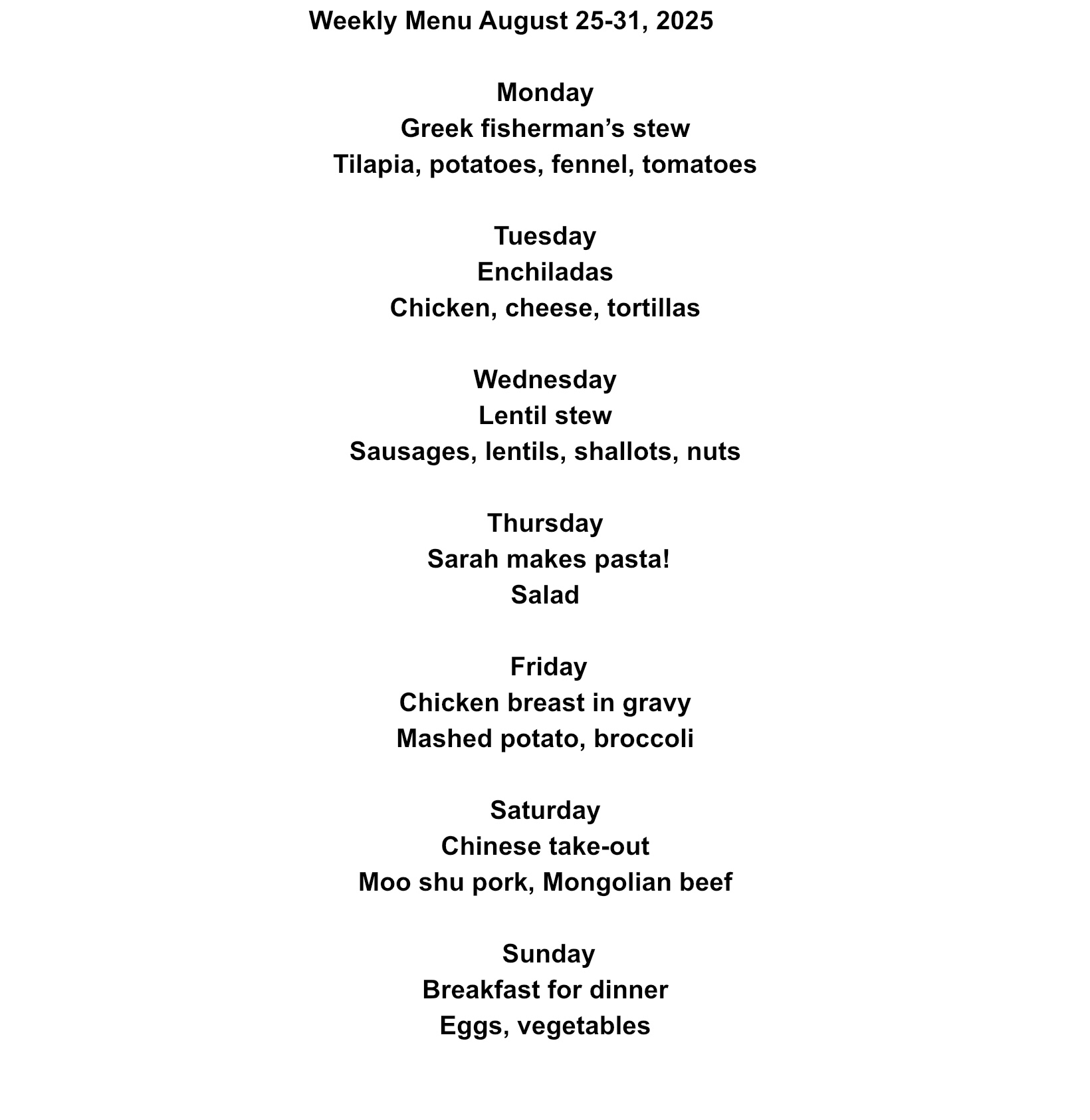 Now that my friend has gone home it is time to get back to my usual posting of a menu and following through with it. John is having a surgical procedure on Wednesday so our cooking options will be limited with no grilling and no complicated meats.