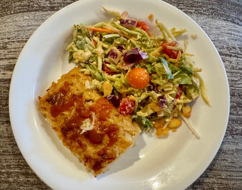 At dinner we each took a block of the gratin and heated it up in the microwave. To be frank the dish was a bit bland. You can see in my picture that I added sriracha to my piece. It also needed more salt than the recipe called for. But all in all with a bright salad accompanying it the dinner was quite good.