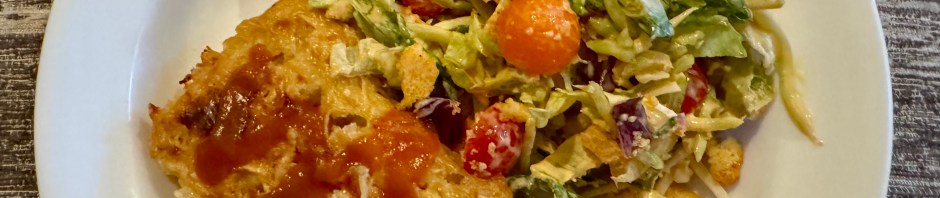 At dinner we each took a block of the gratin and heated it up in the microwave. To be frank the dish was a bit bland. You can see in my picture that I added sriracha to my piece. It also needed more salt than the recipe called for. But all in all with a bright salad accompanying it the dinner was quite good.