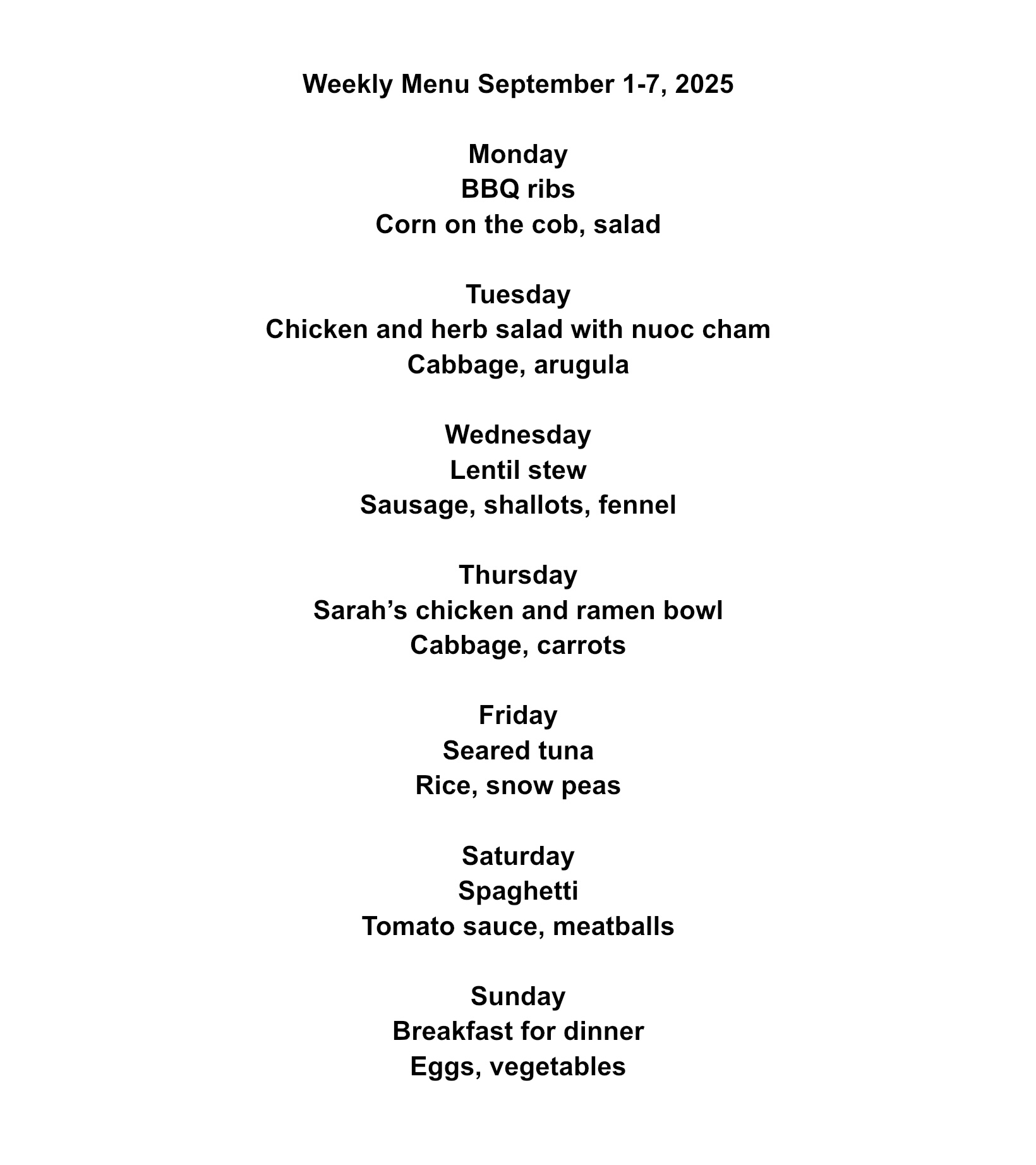 Weekly Menu. September 1-7, 2025