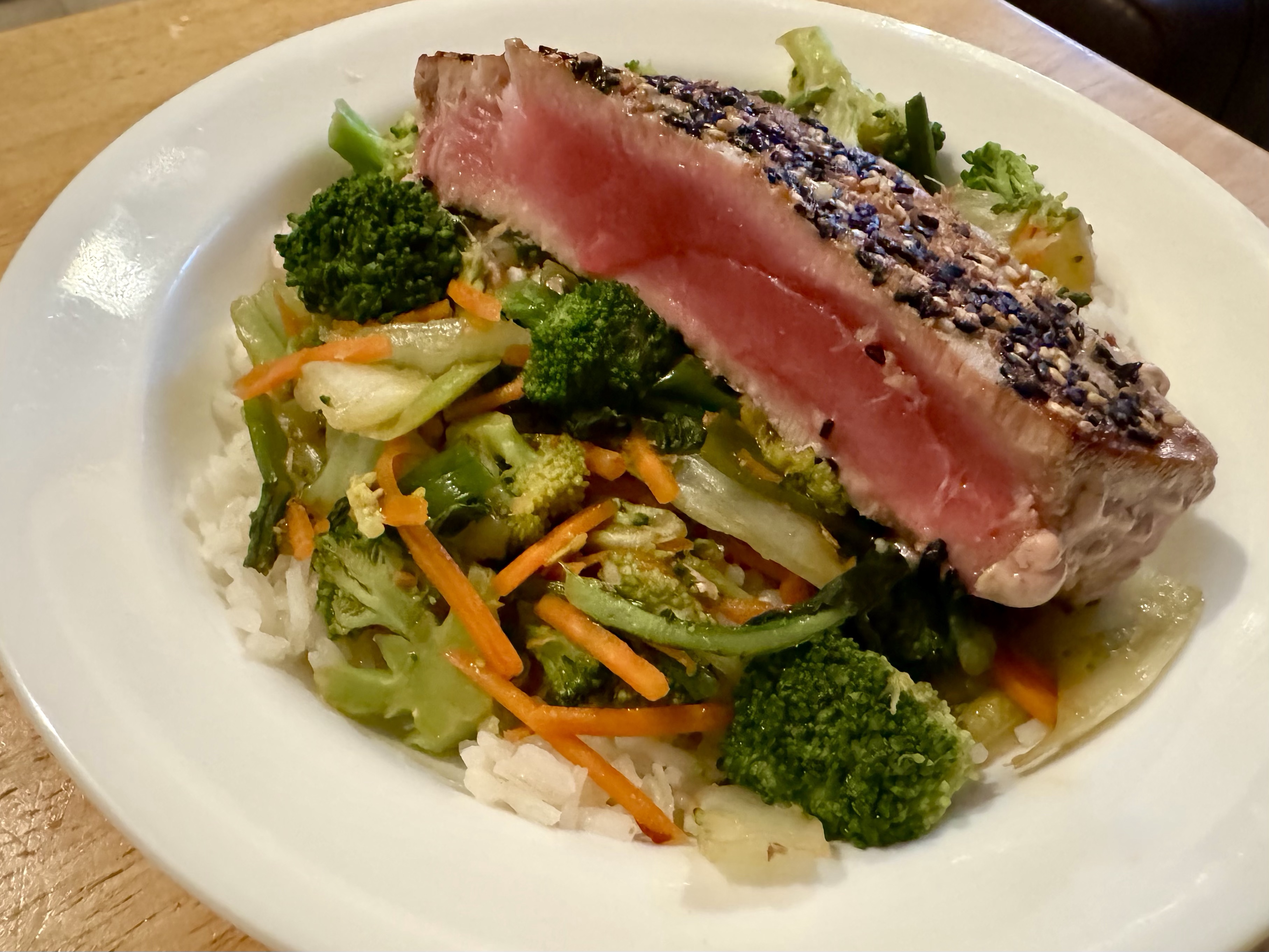 We occasionally buy these frozen pieces of tuna when they are on sale. Two 7-ounce portions at $5 each make a fancy but economical meal for the three of us. John marinates the tuna briefly in soy sauce and presses sesame seeds into the fish. He cooks it very briefly in a hot pan, only a couple of minutes on each side. While he is working on the fish I reheat some pre-made rice and briefly steam the vegetables. I have already put together a sauce for the vegetables.